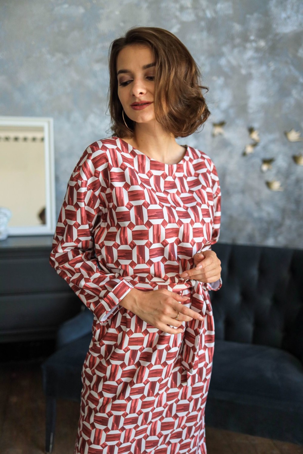 Платье полуприлегающего силуэта с длинным рукавом. В комплекте пояс из основного полотна. Есть карманы. Застежка на потайную молнию на спинке.