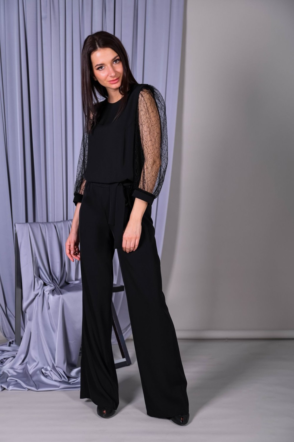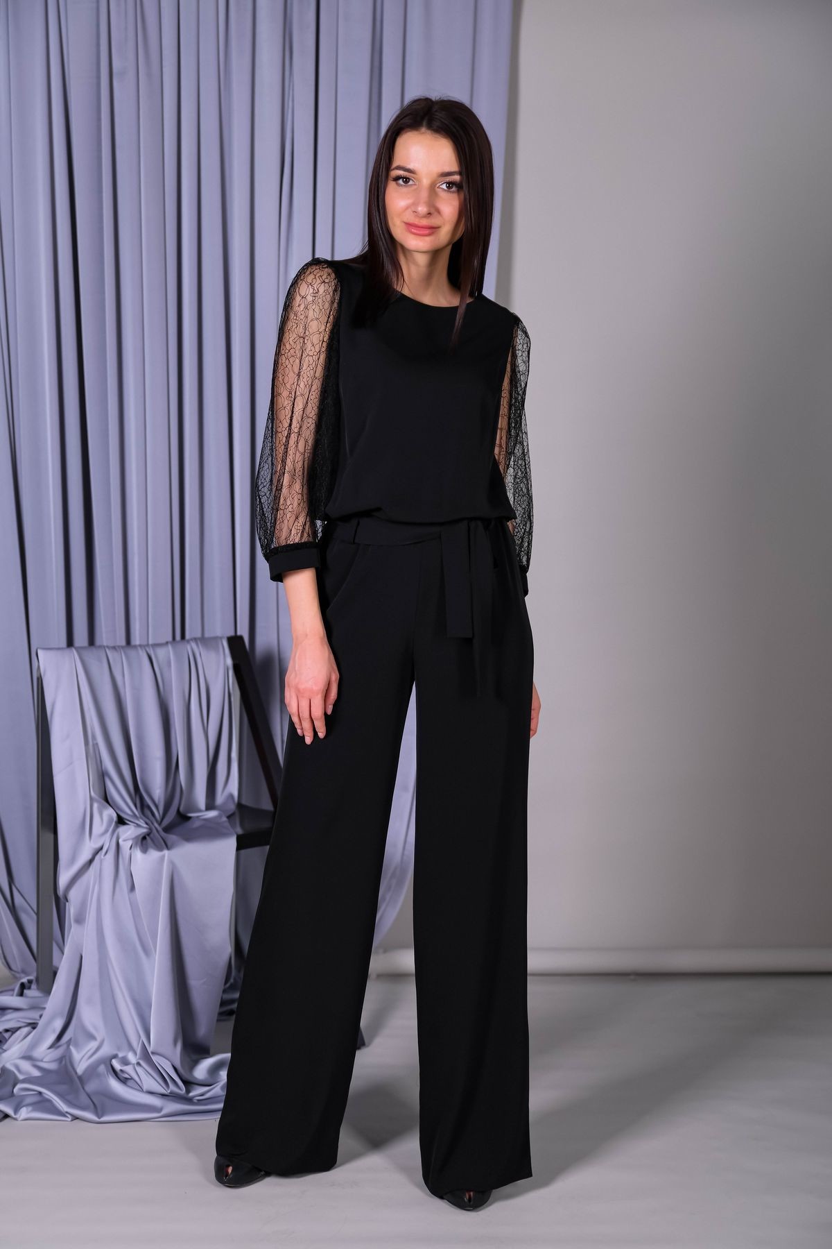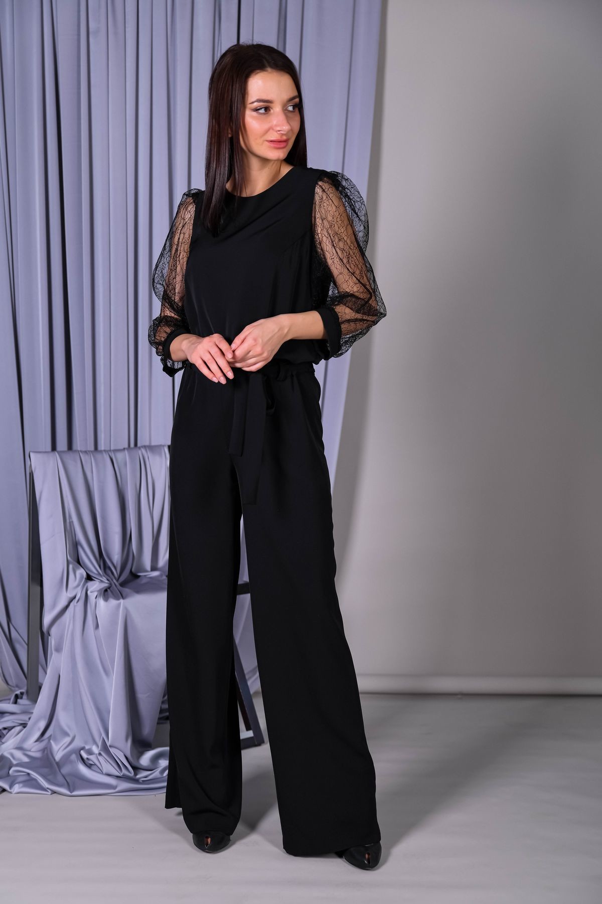 Лаконичный комбинезон с кружевными рукавами. Вырез горловины-лодочка, застежка на спинке. Пышные втачные рукава обработаны манжетами. В талии резинка для удобства посадки, в комплекте пояс из основного полотна.