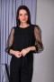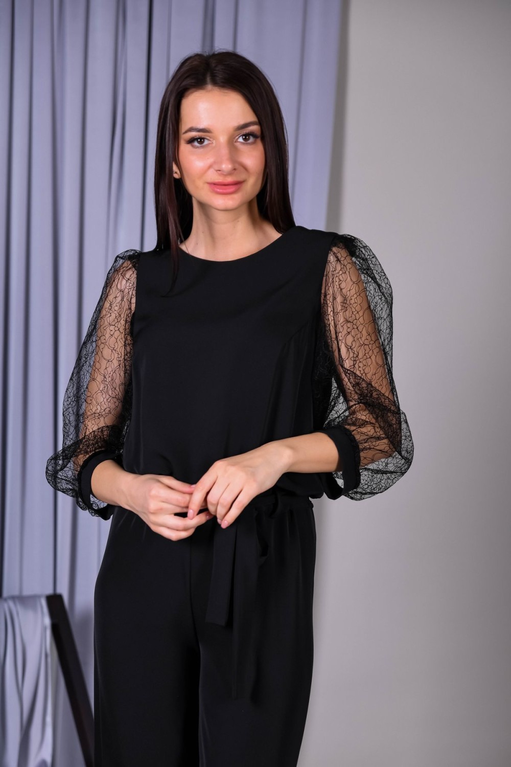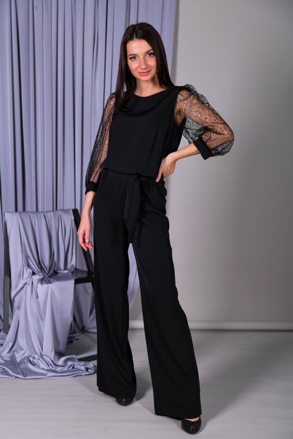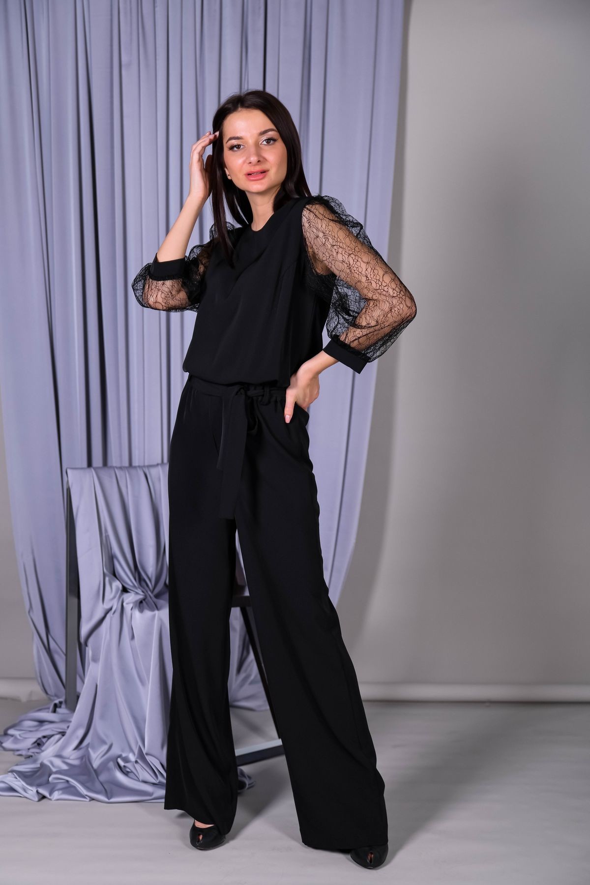 Лаконичный комбинезон с кружевными рукавами. Вырез горловины-лодочка, застежка на спинке. Пышные втачные рукава обработаны манжетами. В талии резинка для удобства посадки, в комплекте пояс из основного полотна.