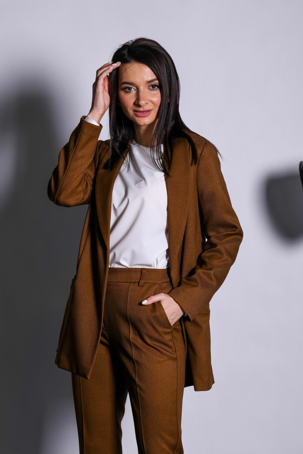 Жакет прямого силуэта. Длинный втачной рукав, есть карманы. Магнитная застежка.