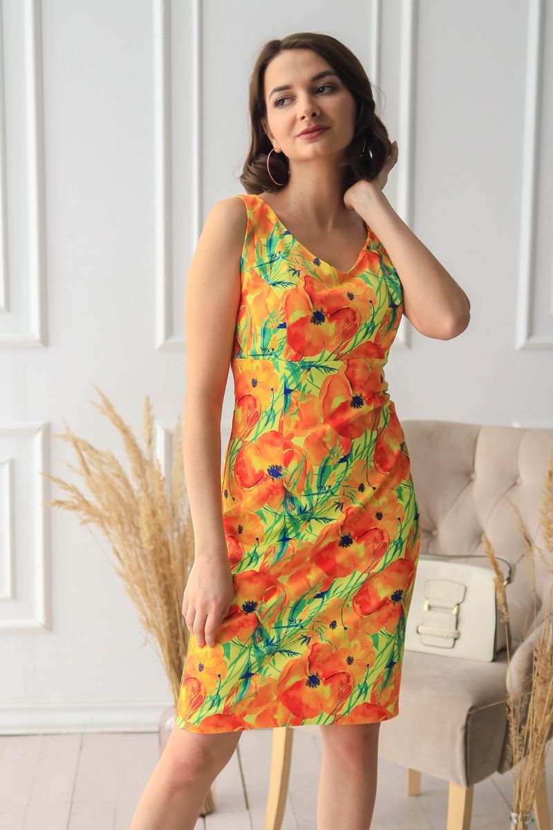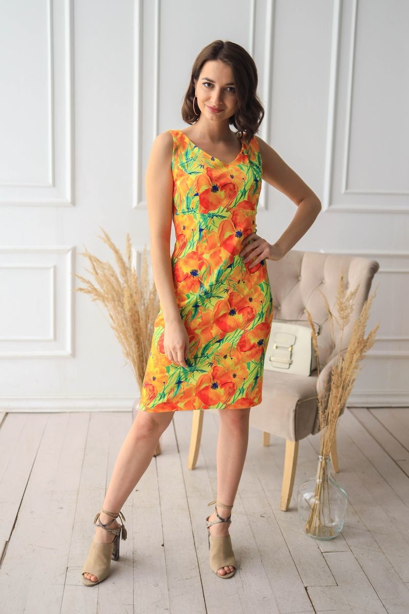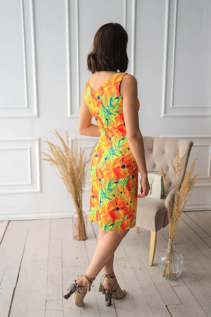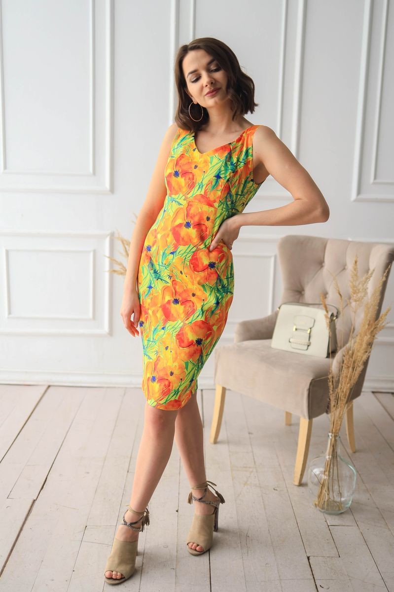 Платье-футляр. V-образный вырез горловины, застежка на потайную молнию на спинке, разрез