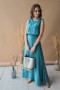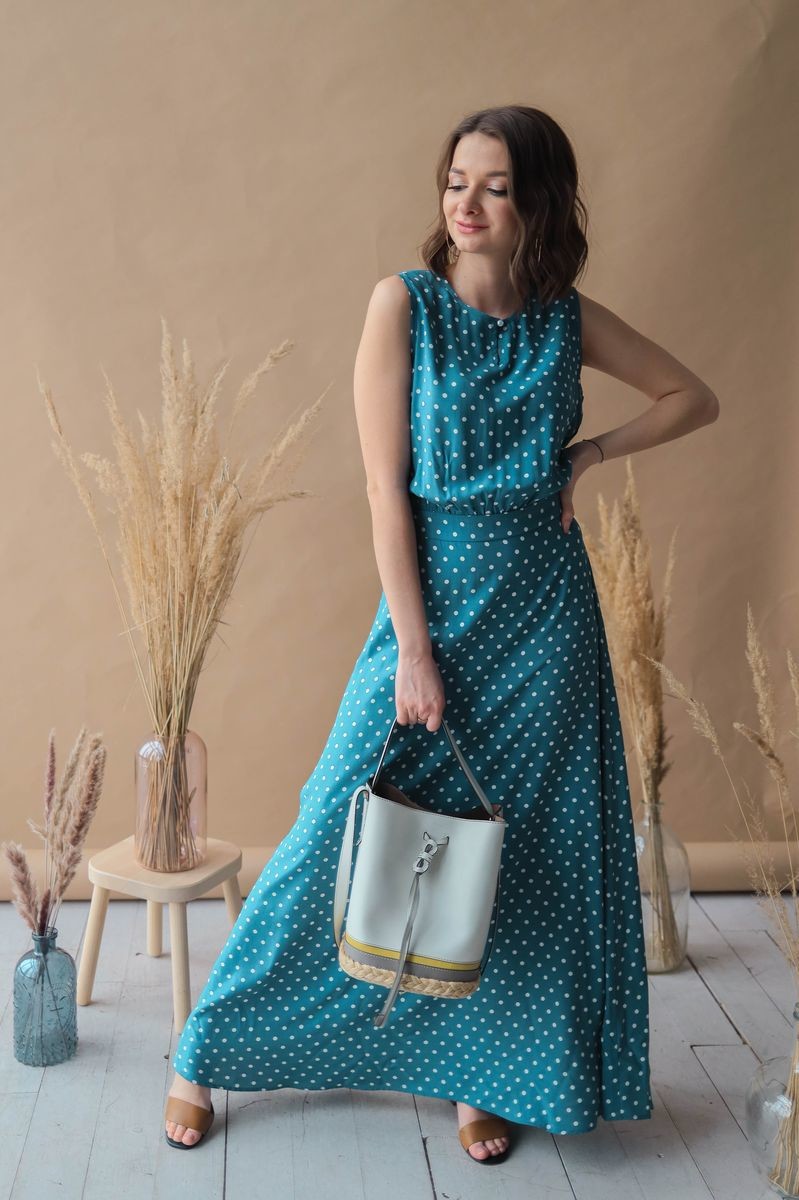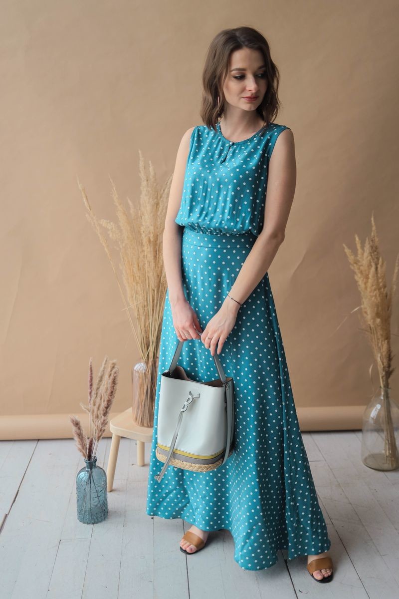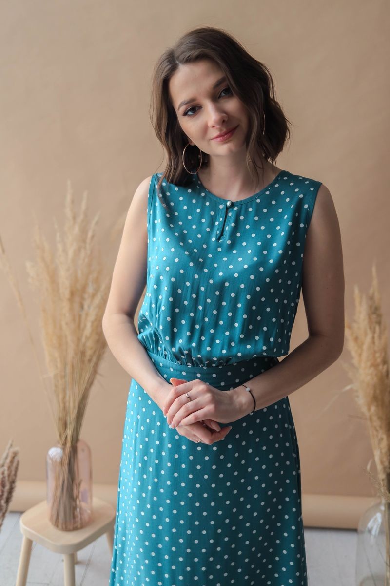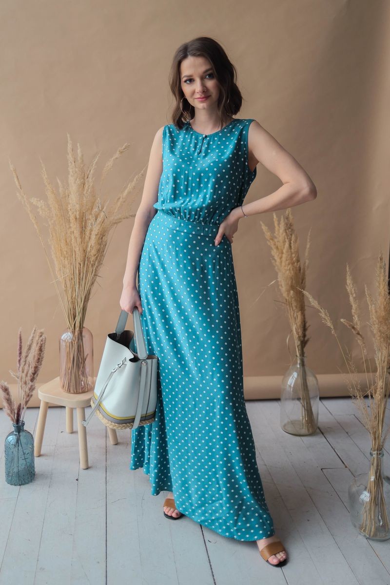 Платье без рукавов длины макси. Вырез-капелька с застежкой на пуговицу. В талии сзади резинка.