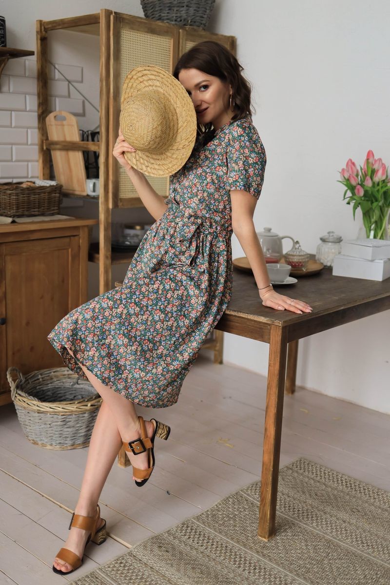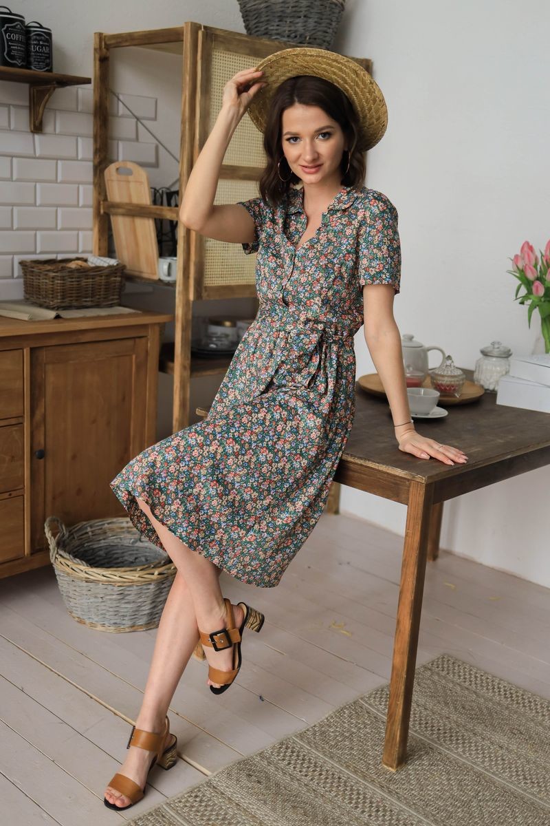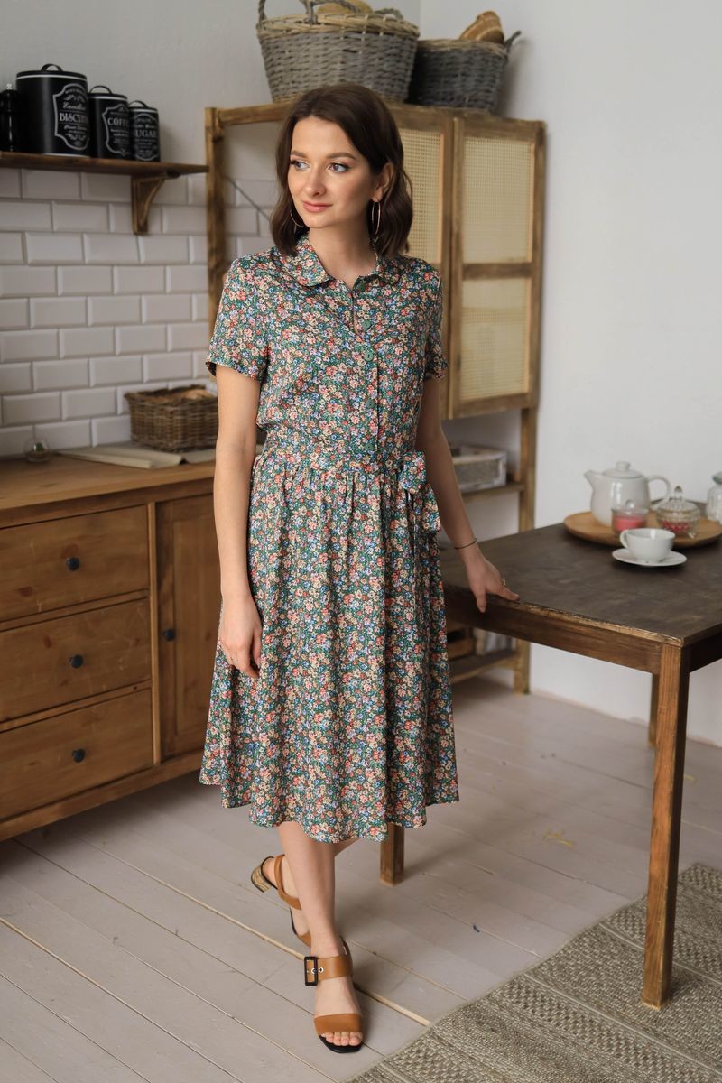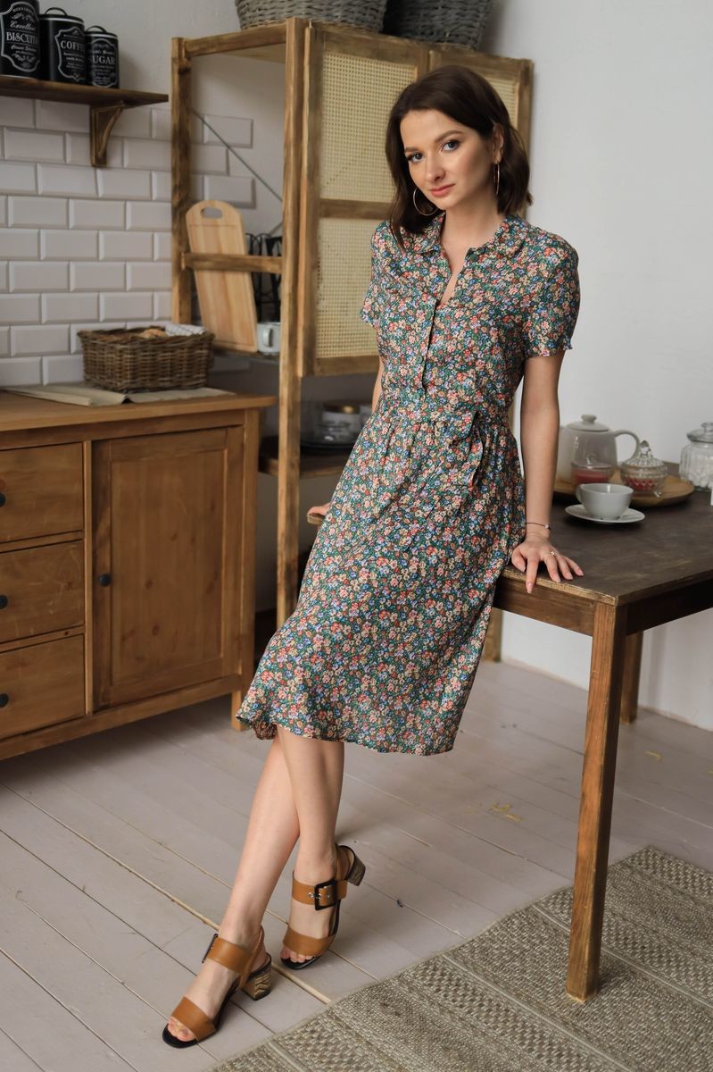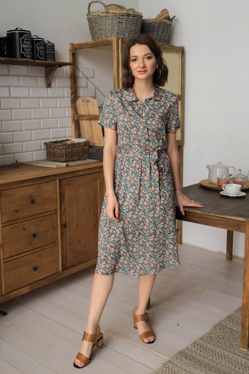 Платье с поясом. Отложной воротник, короткий втачной рукав.Застежка на пуговицы.