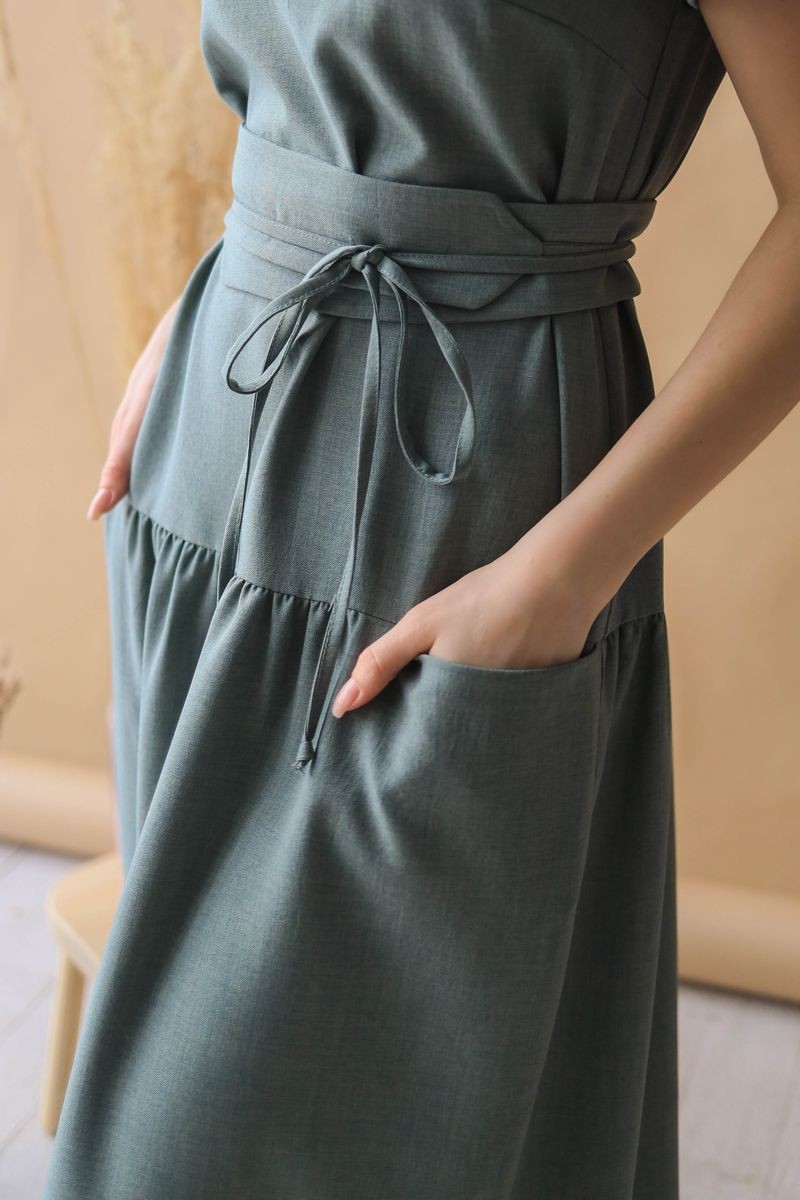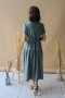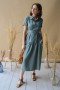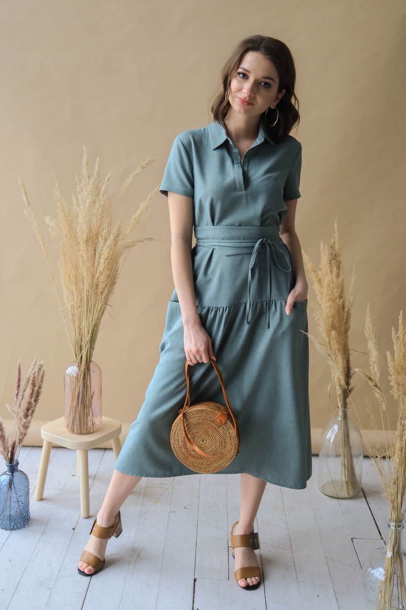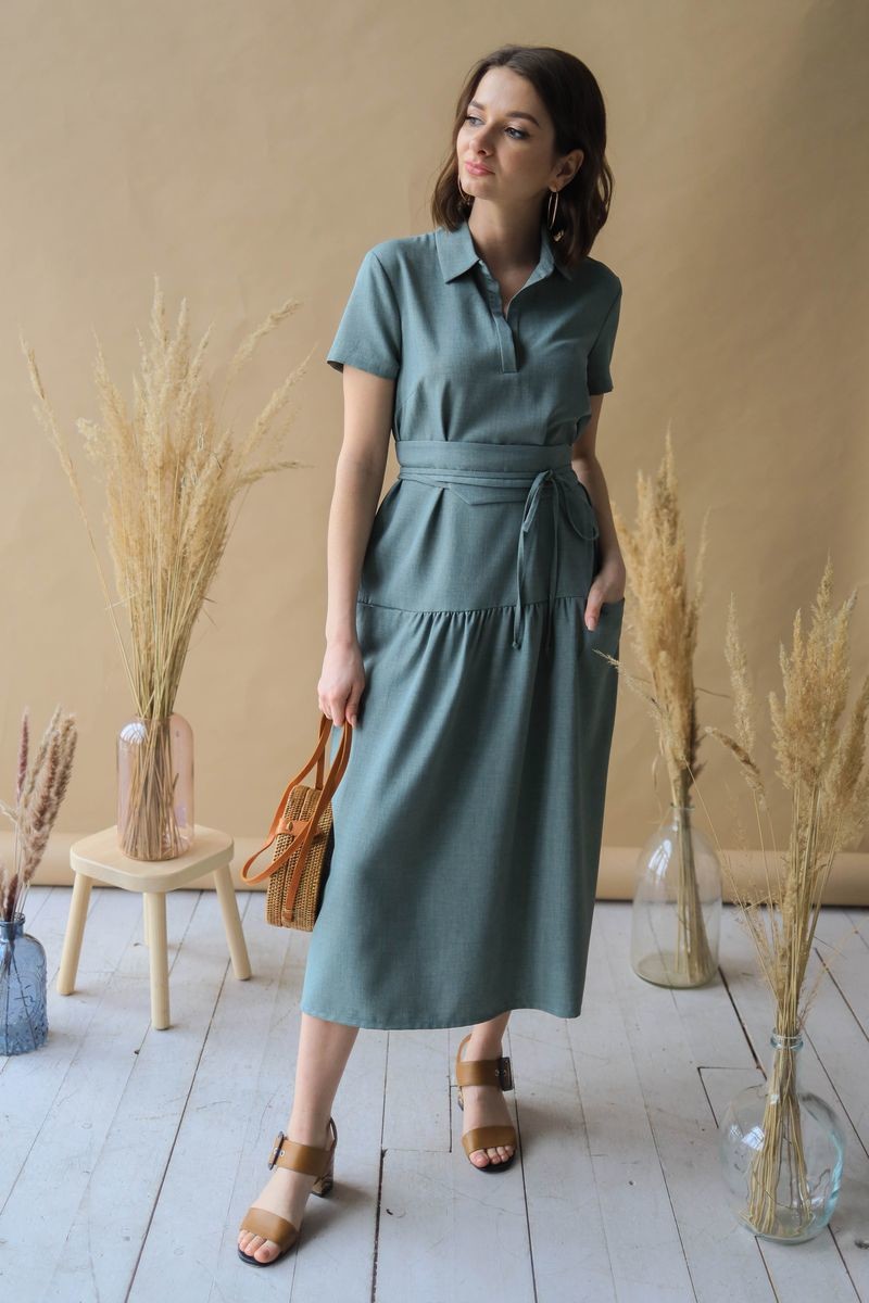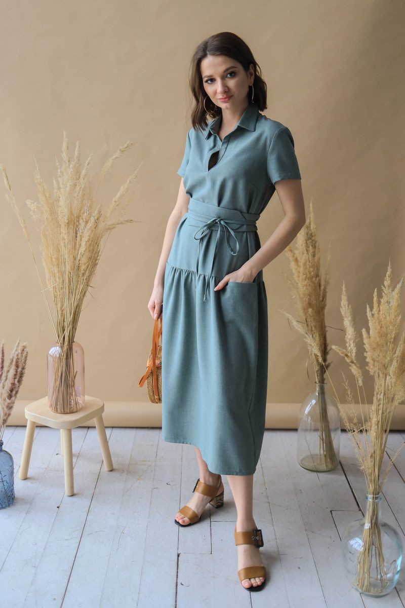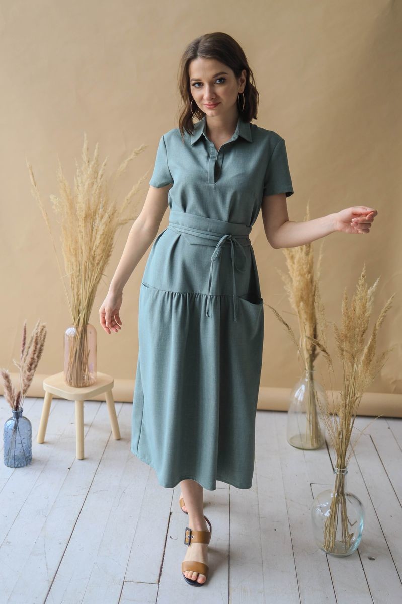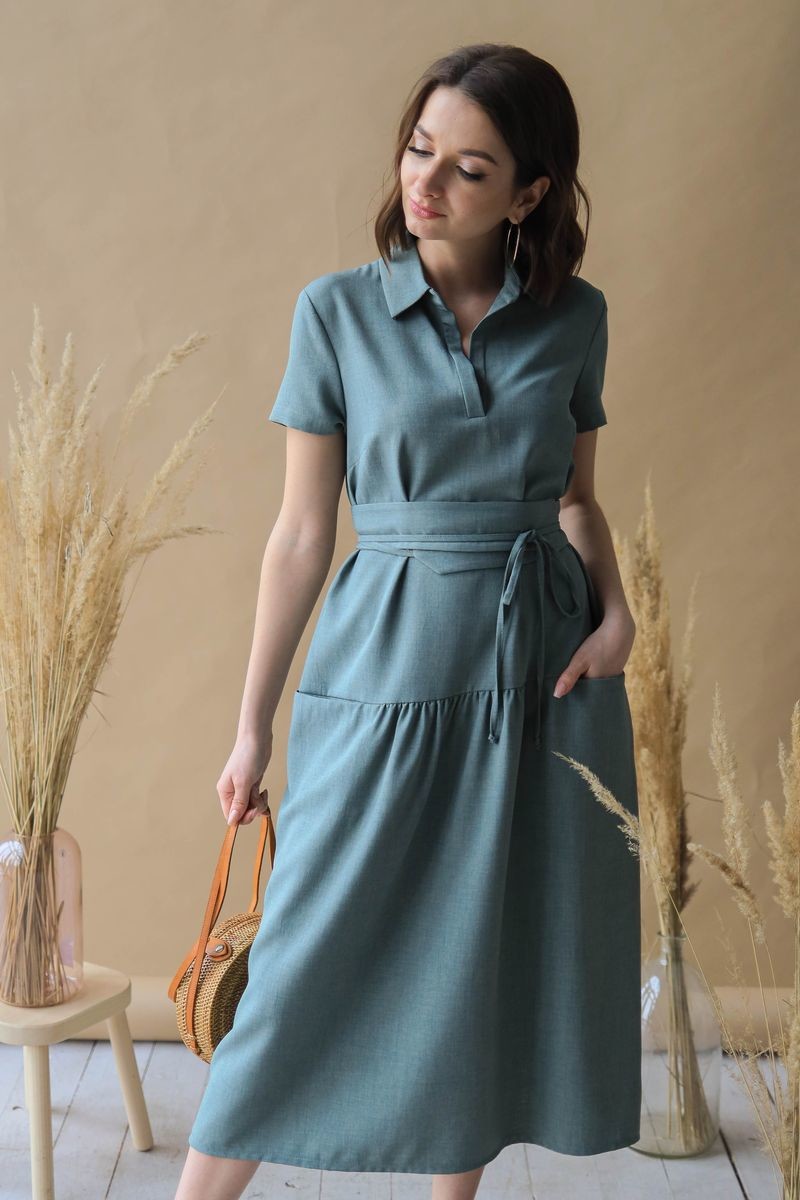 Платье длины миди. Накладные карманы, отложной воротник, переходящий в элегантный разрез. Короткий втачной рукав. Платье комплектуется широким поясом из основного полотна.