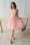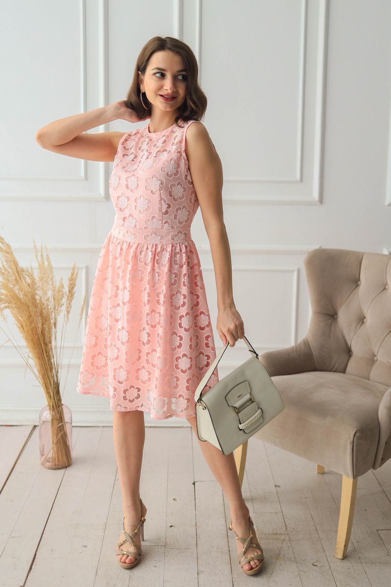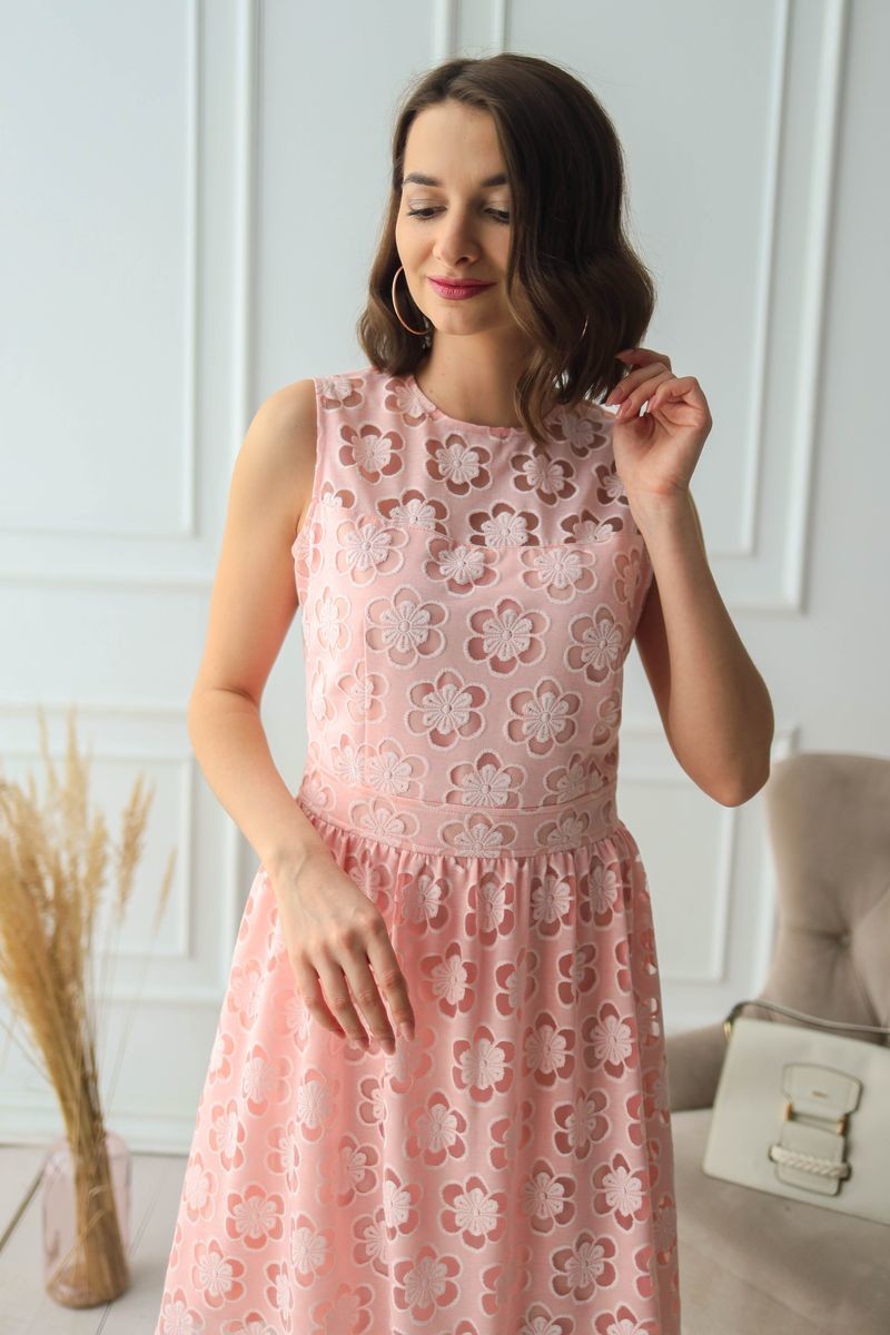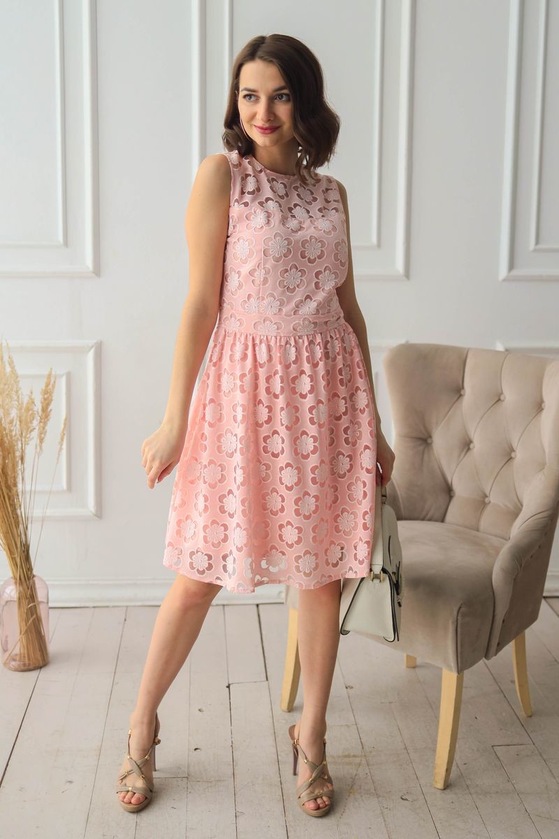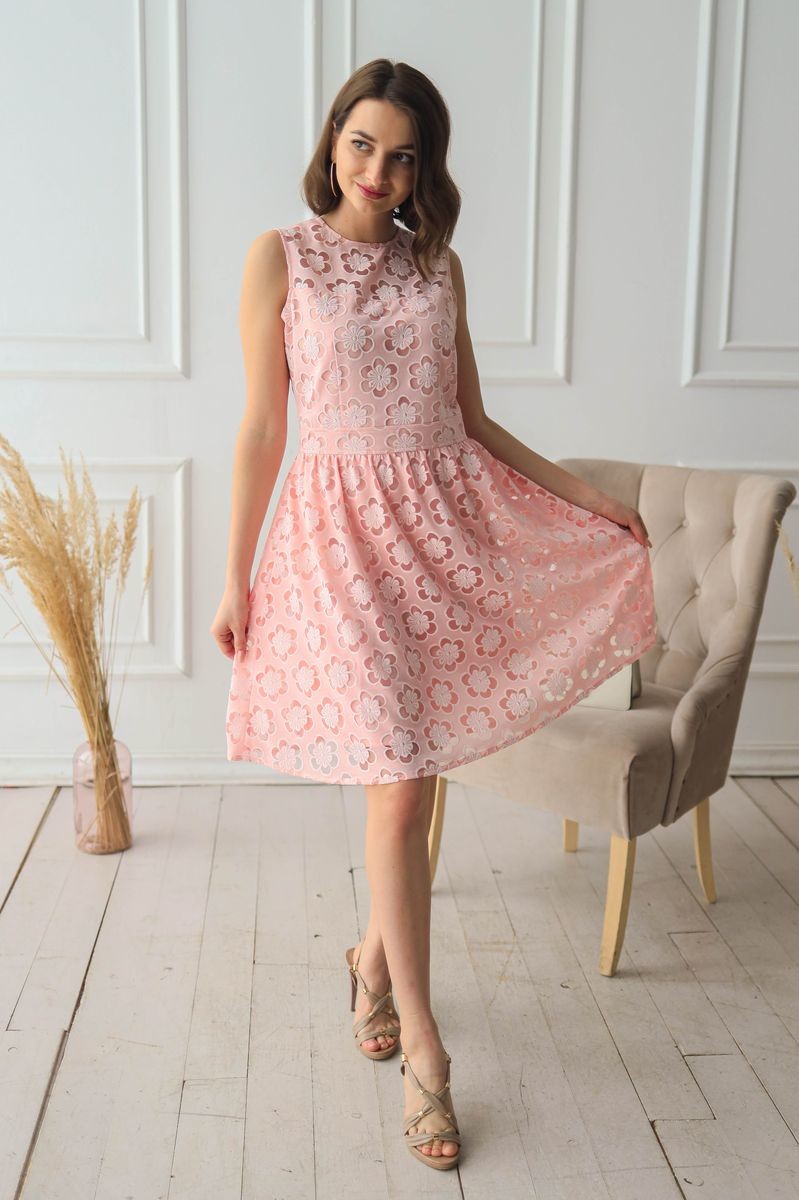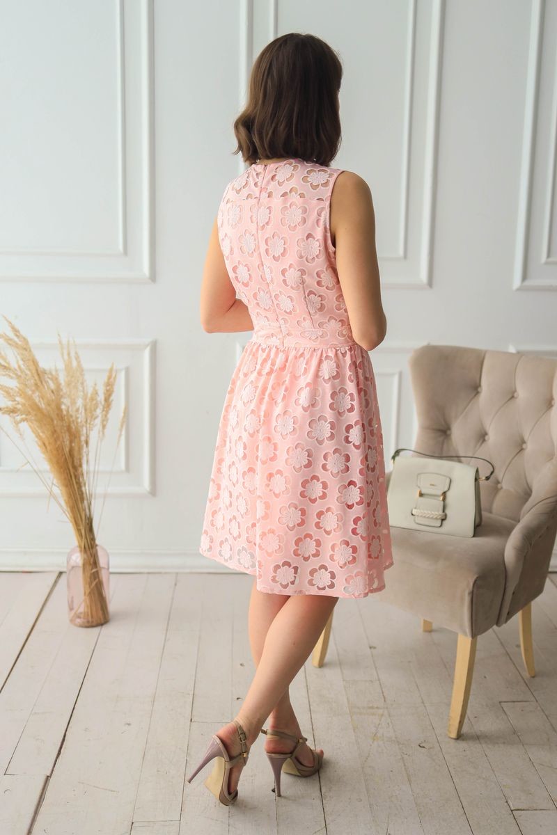 Платье из кружевного полотна. Полочка, спинка и юбка модели продублированы подкладкой из тонкой вискозы. Застежка на потайную молнию на спинке.