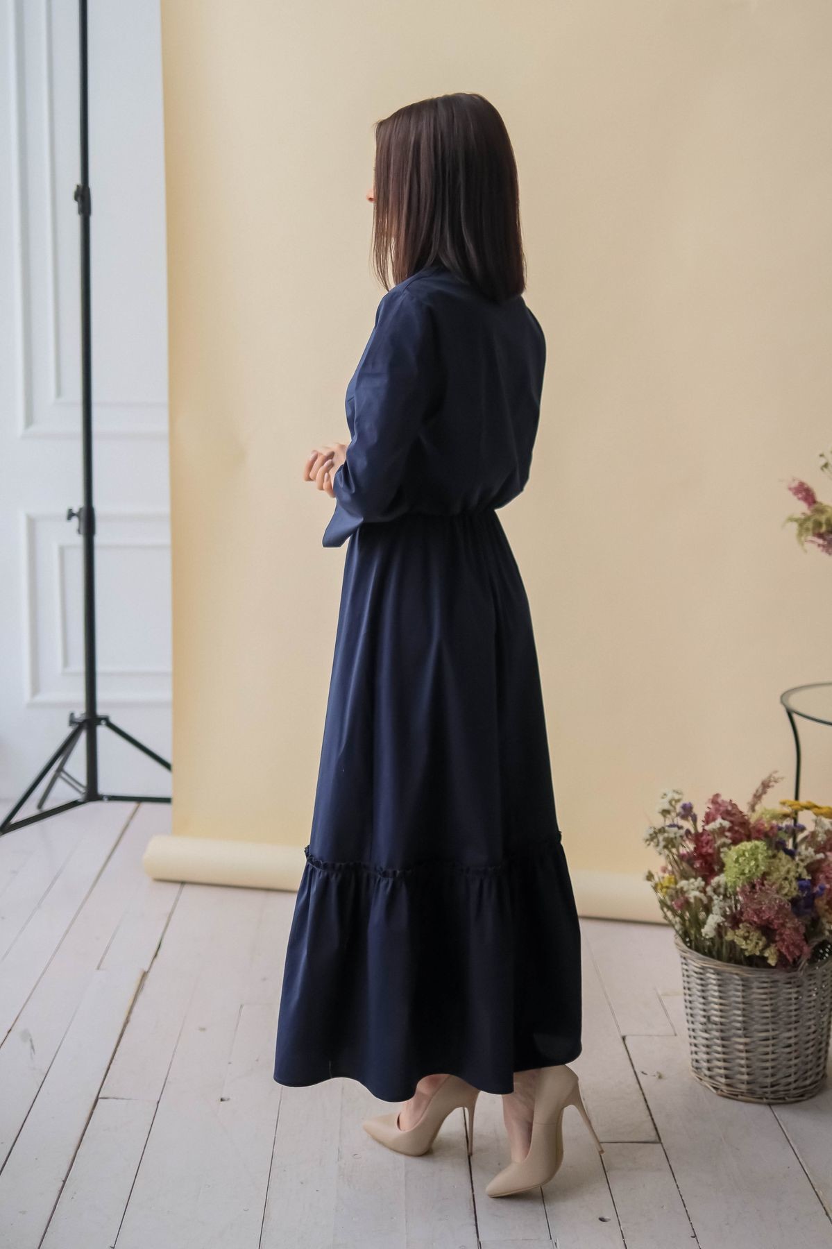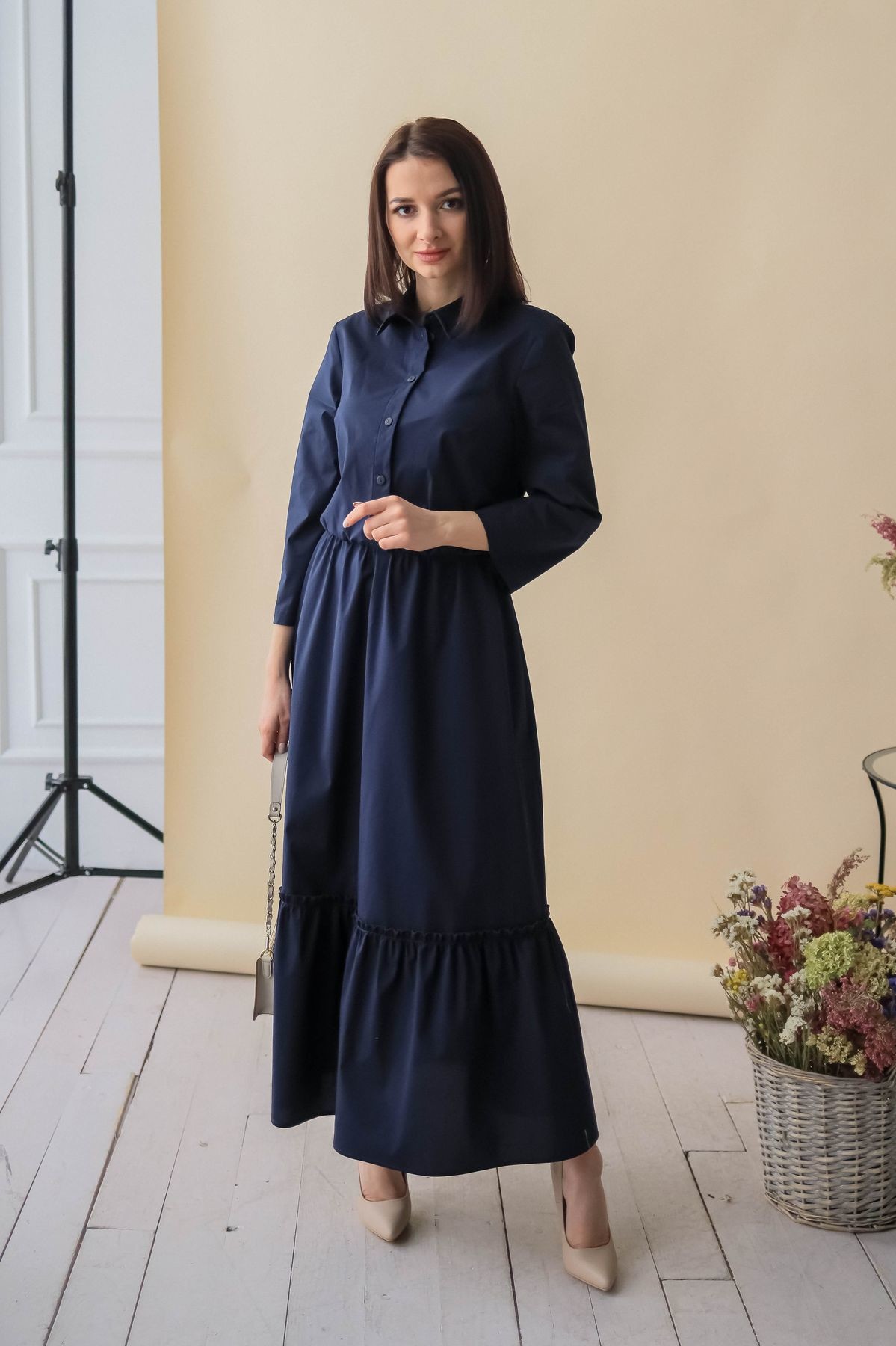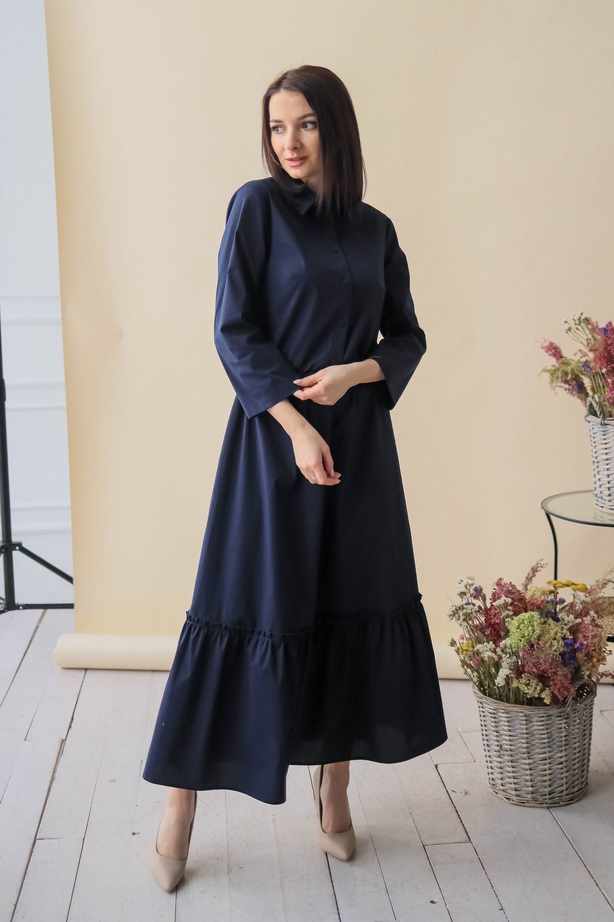 Элегантное платье длины макси. Отложной воротник, застежка-поло на пуговицы. Втачной рукав обработан отворотом. В талии резинка. К подолу юбки пришит присборенный волан, придающий модели пышности.
