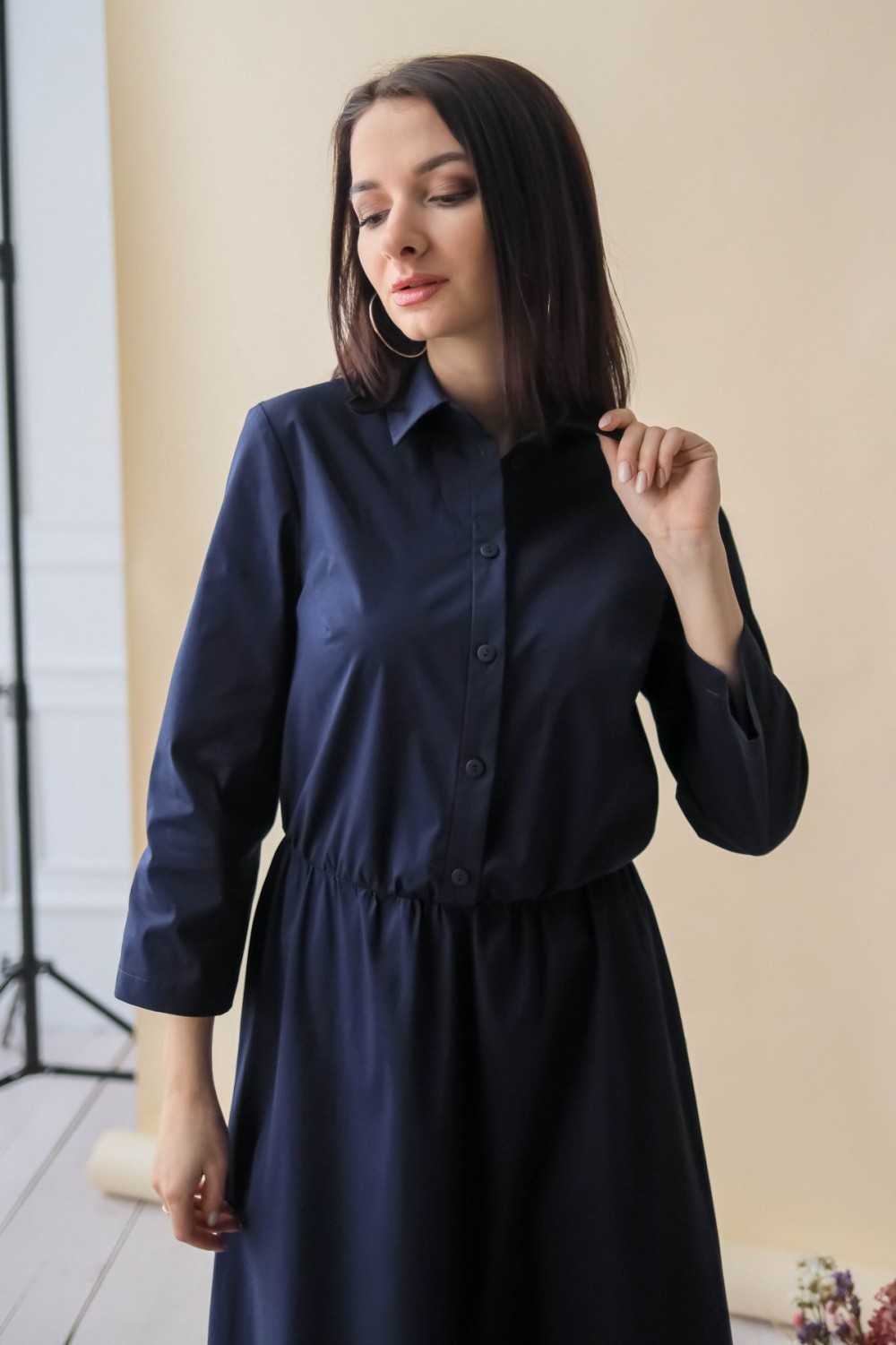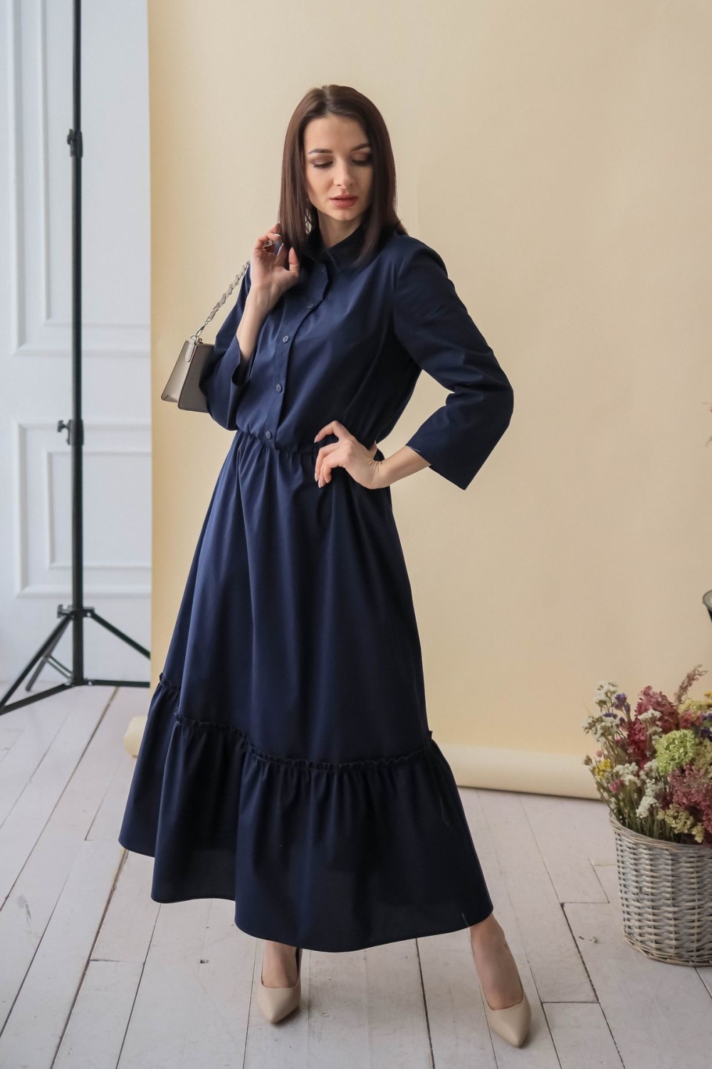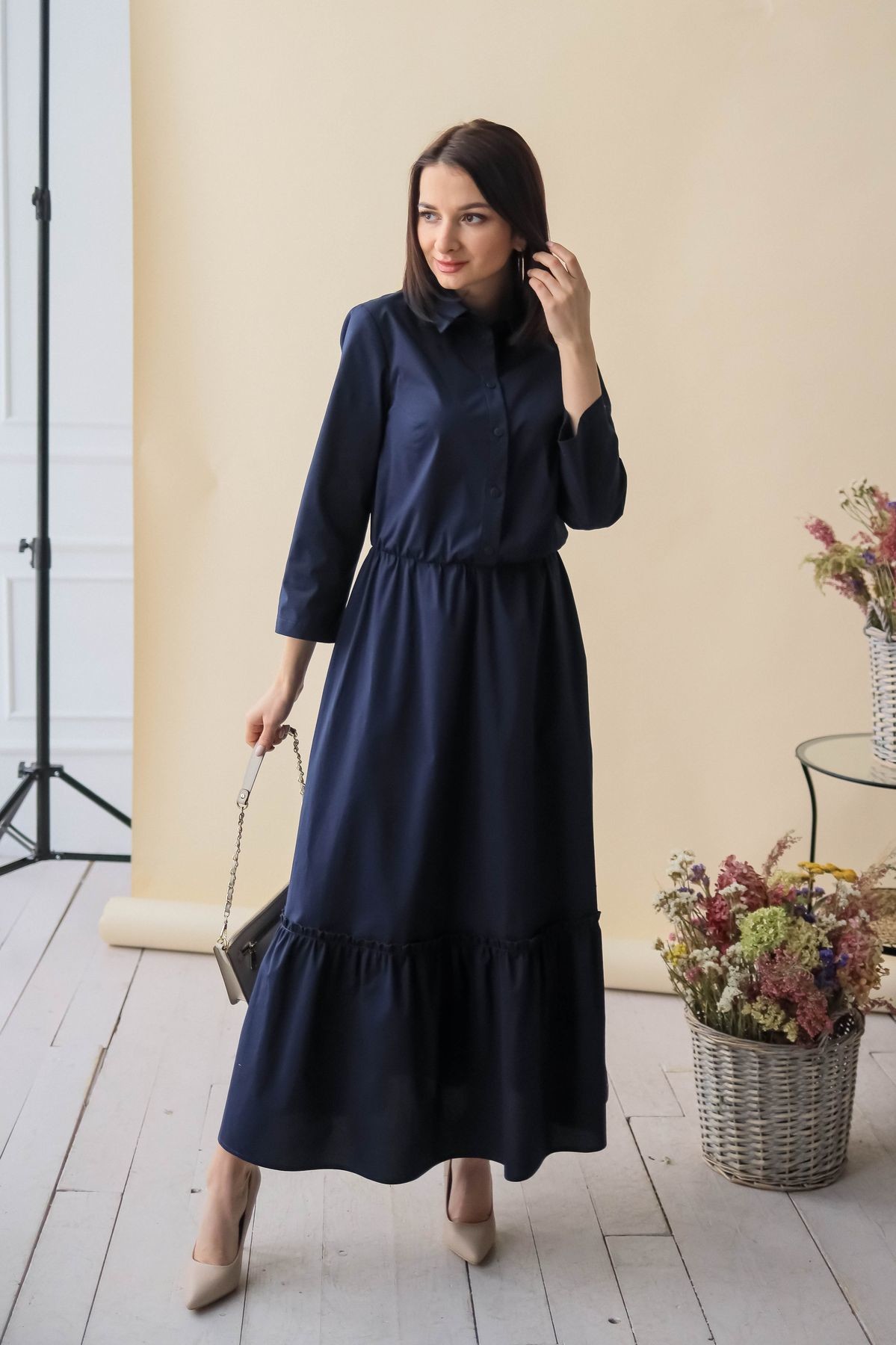 Элегантное платье длины макси. Отложной воротник, застежка-поло на пуговицы. Втачной рукав обработан отворотом. В талии резинка. К подолу юбки пришит присборенный волан, придающий модели пышности.