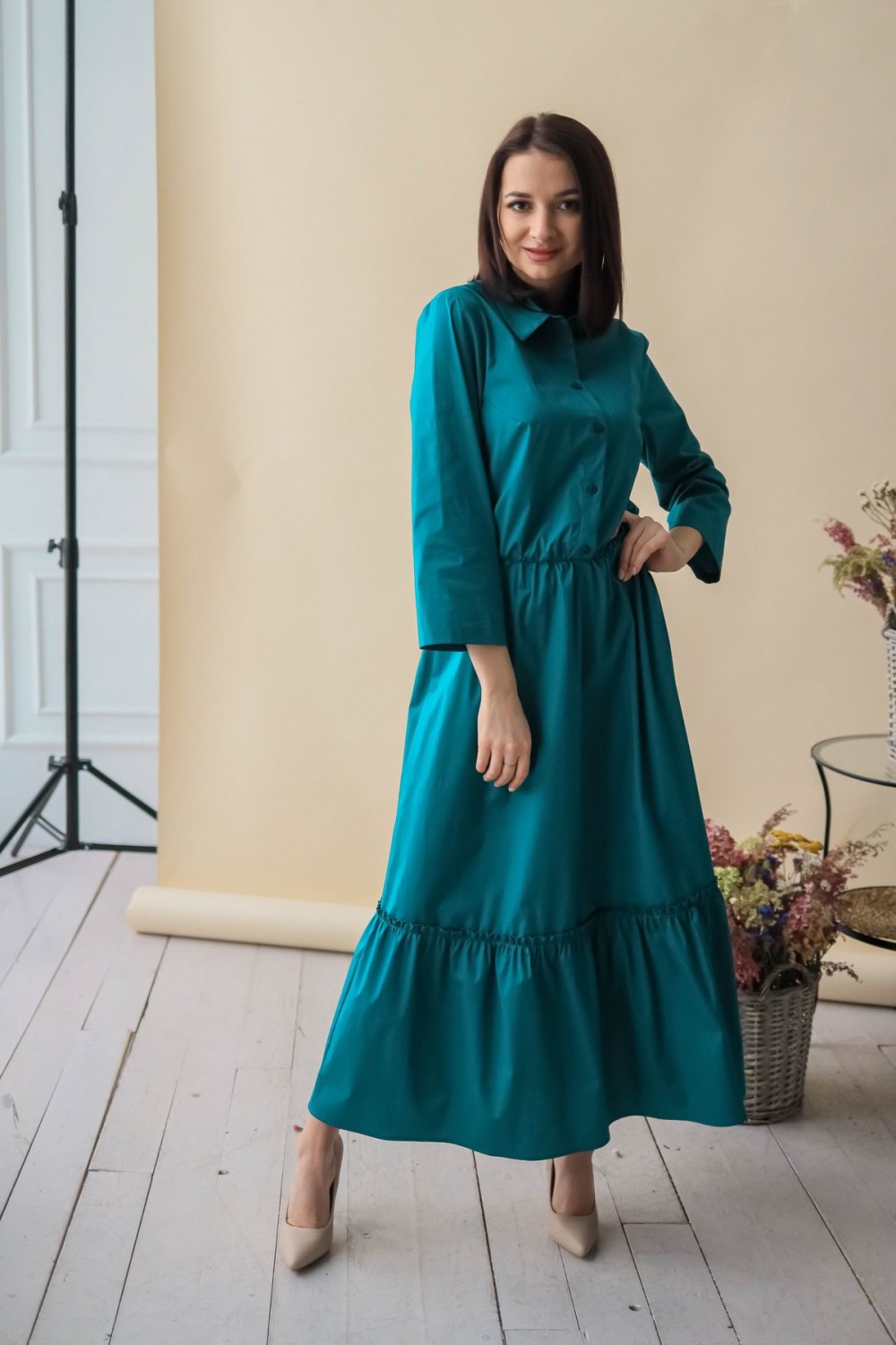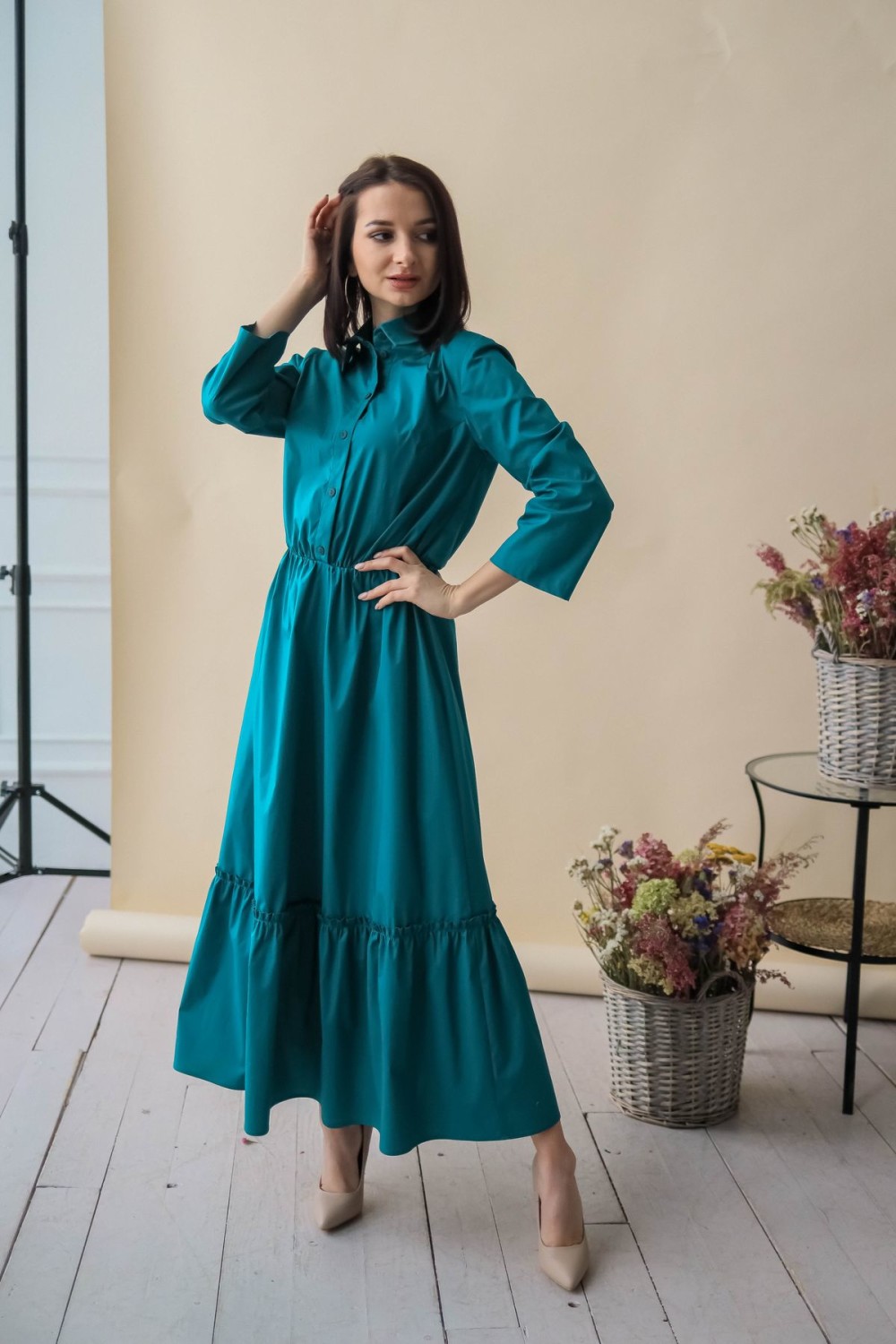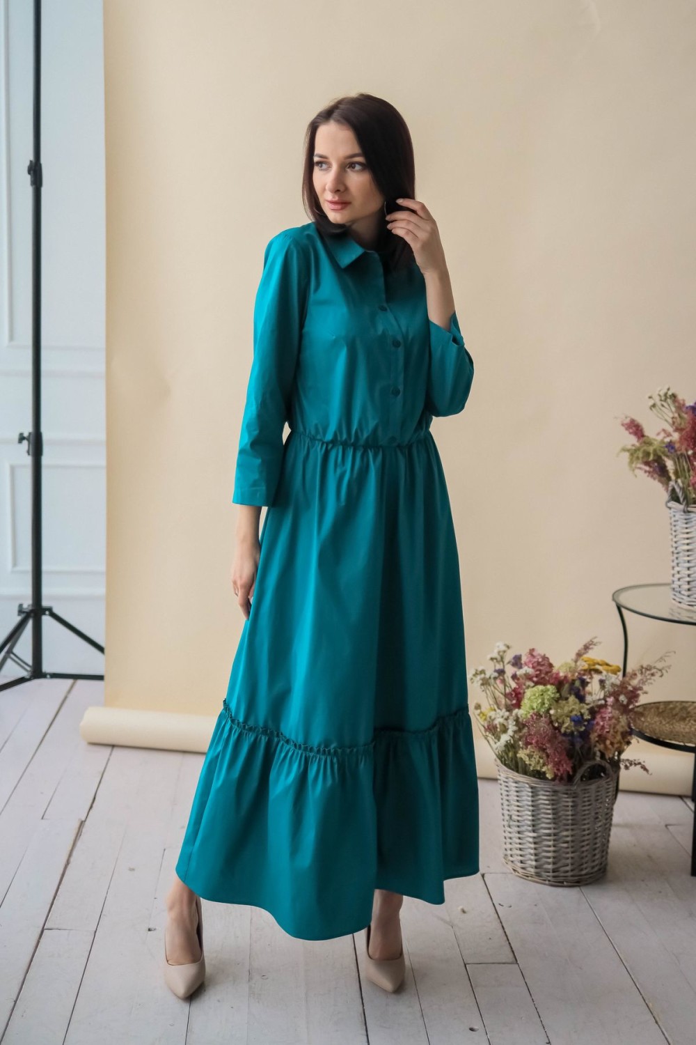 Элегантное платье длины макси. Отложной воротник, застежка-поло на пуговицы. Втачной рукав обработан отворотом. В талии резинка. К подолу юбки пришит присборенный волан, придающий модели пышности.