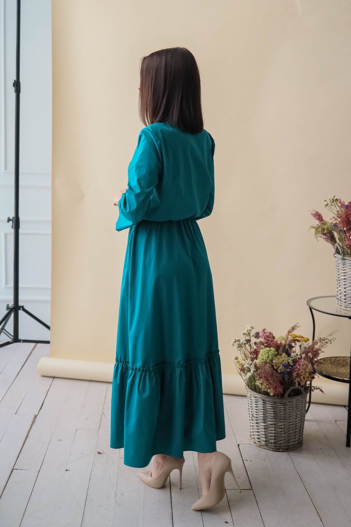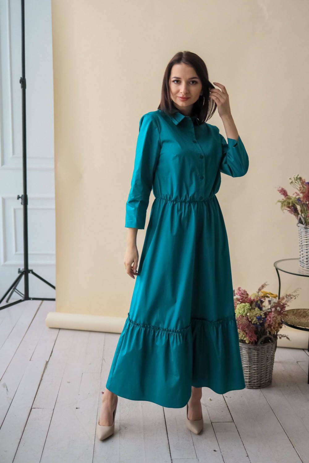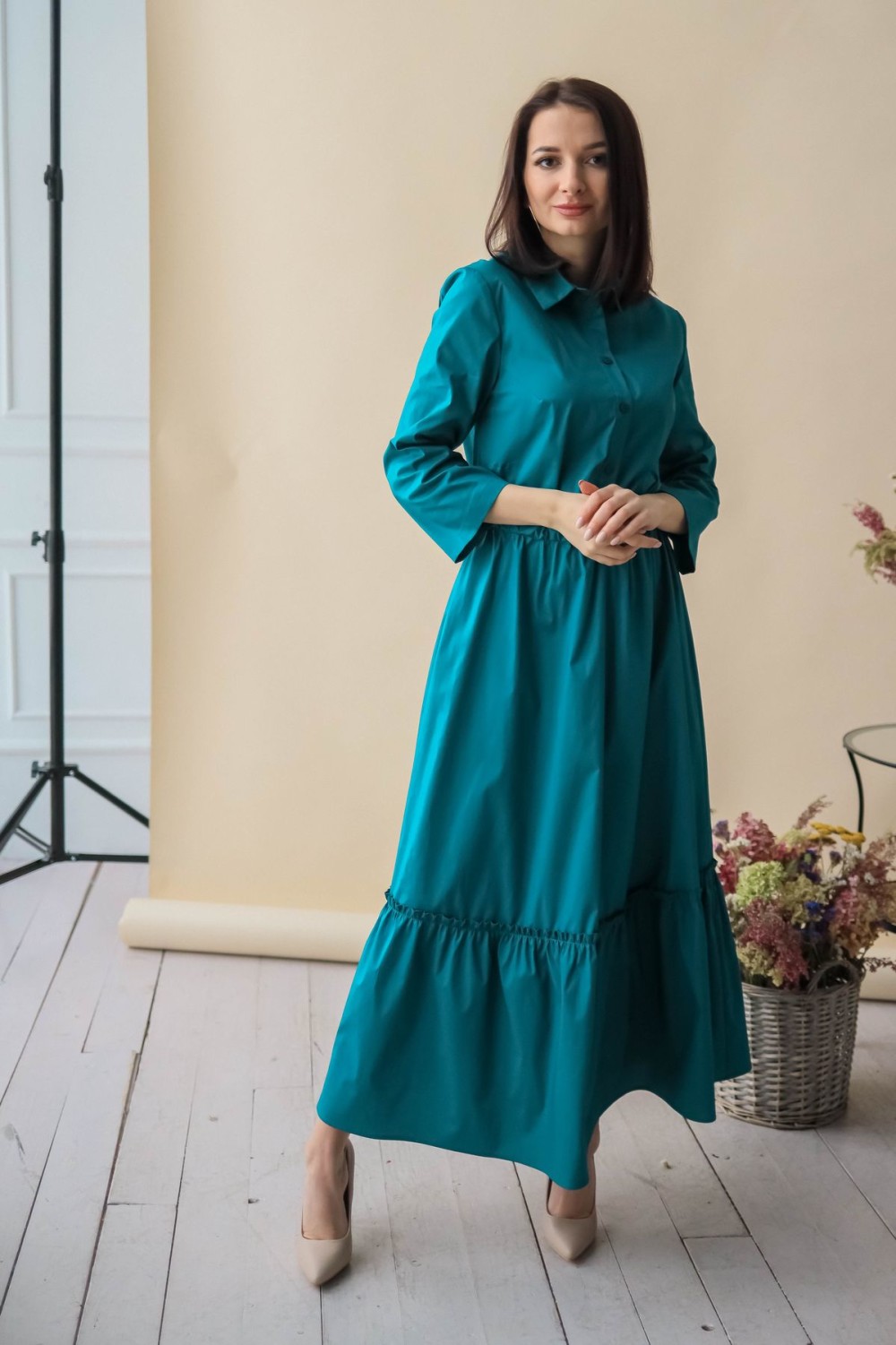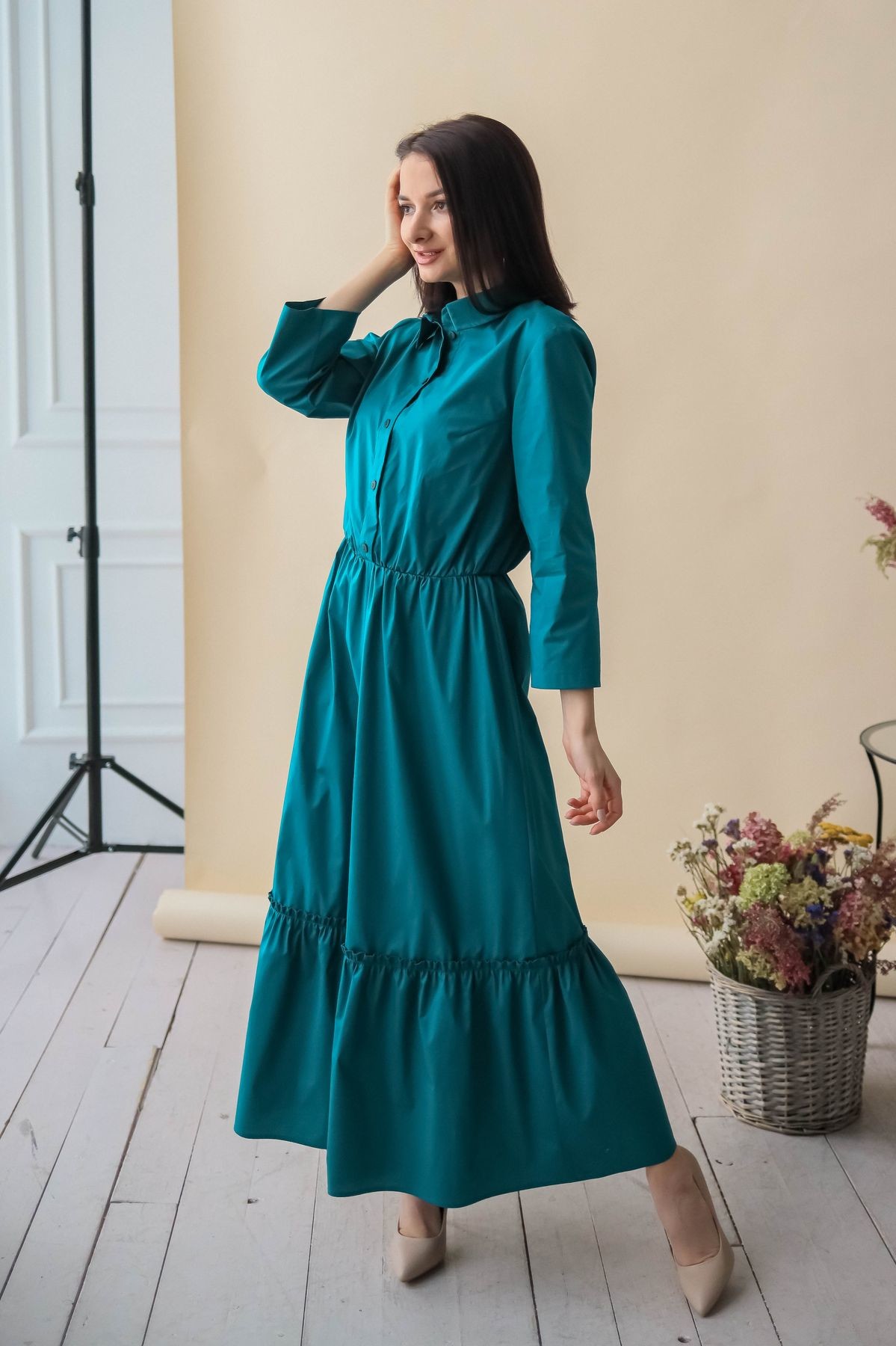 Элегантное платье длины макси. Отложной воротник, застежка-поло на пуговицы. Втачной рукав обработан отворотом. В талии резинка. К подолу юбки пришит присборенный волан, придающий модели пышности.
