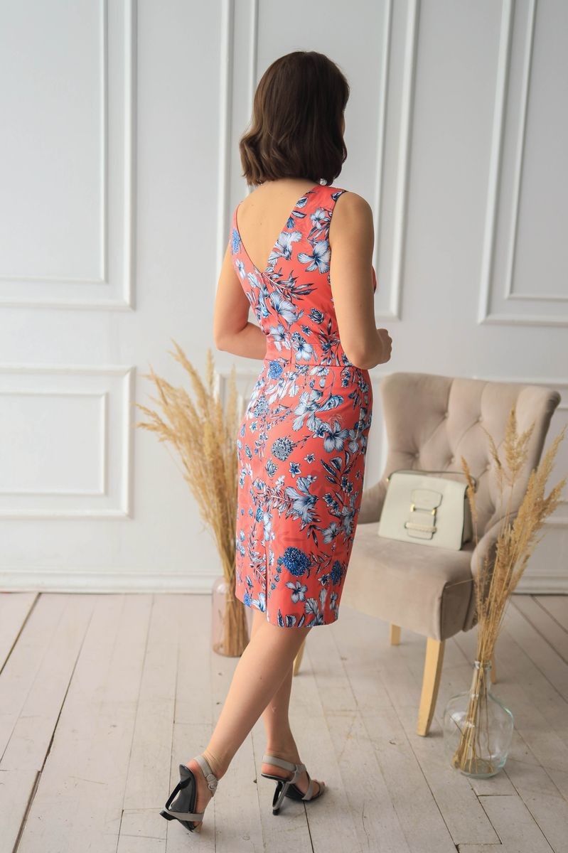 Платье-футляр прилегающего силуэта. Вырез горловины лодочкой, V-образный вырез на спинке, застежка на потайную молнию. Разрез.