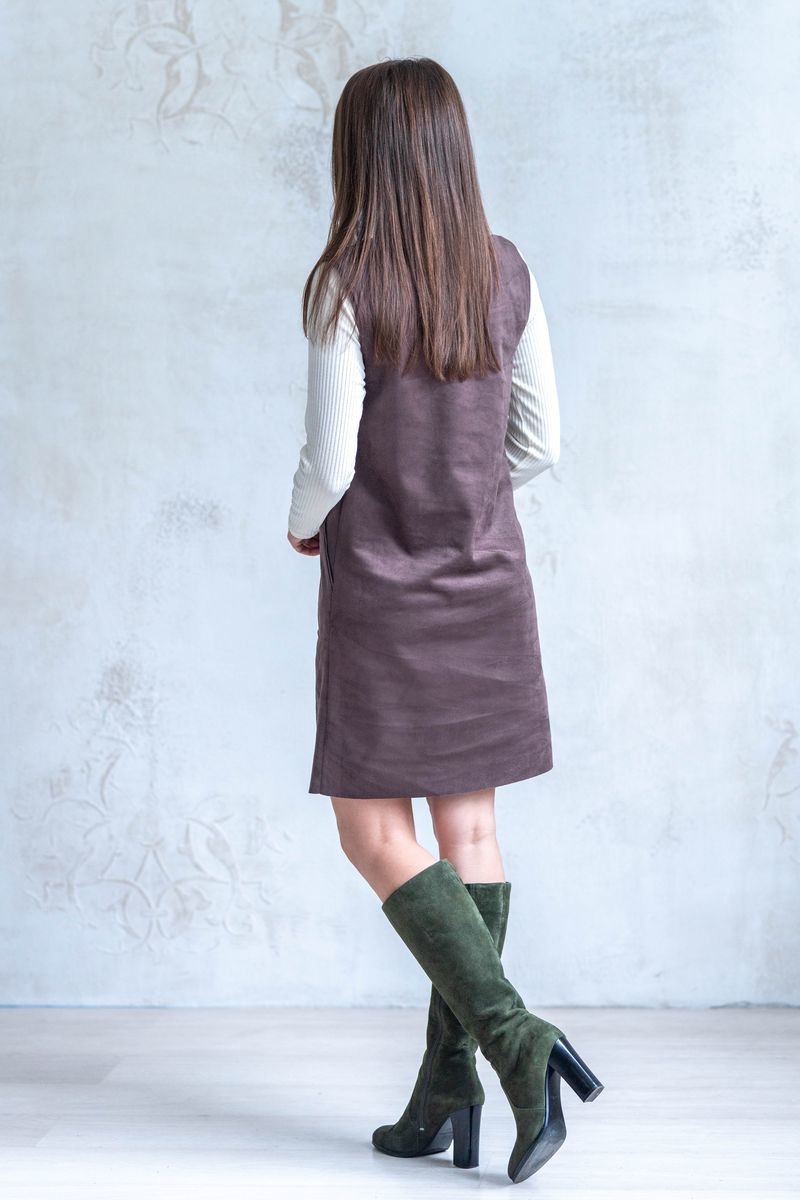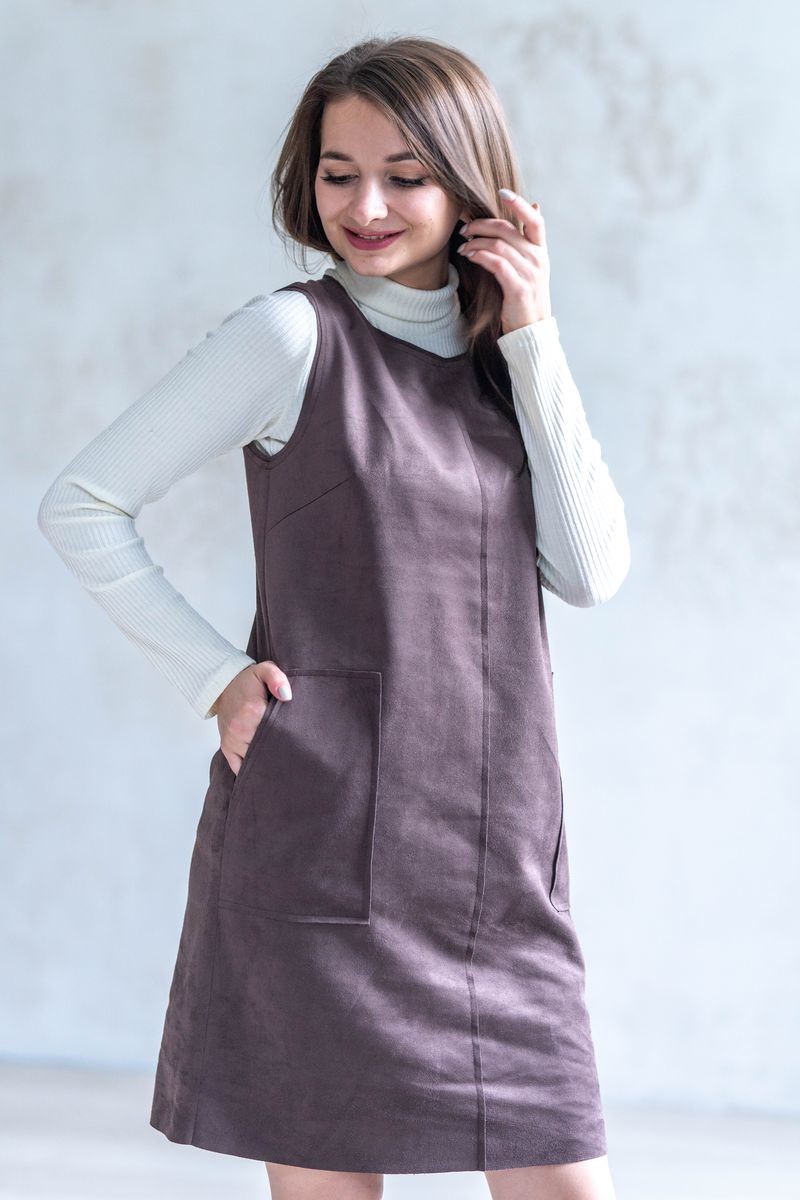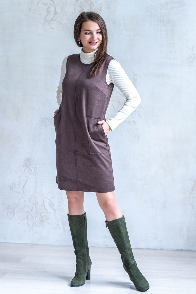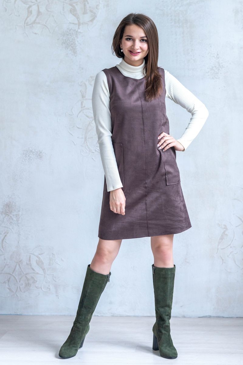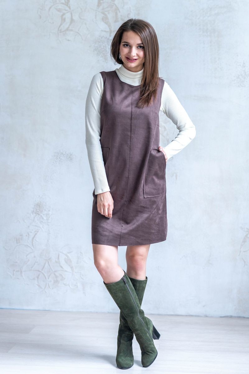 Стильный сарафан из мягкой искусственной замши. Модель прямого силуэта длиной выше колена (на рост 164 см.). Есть выточки. Накладные карманы. В качестве нижнего слоя прекрасно смотрится с водолазками, блузками и джемперами - найдите свое стильное сочетание!