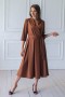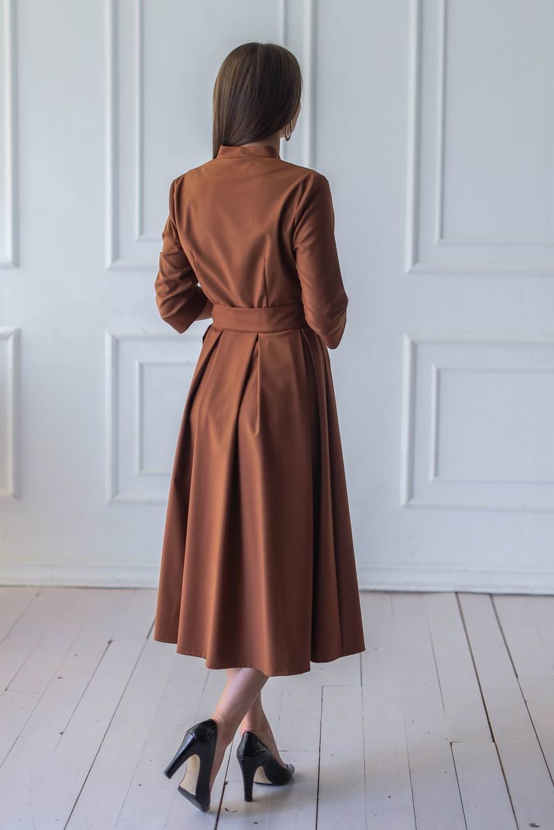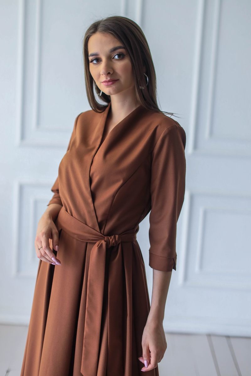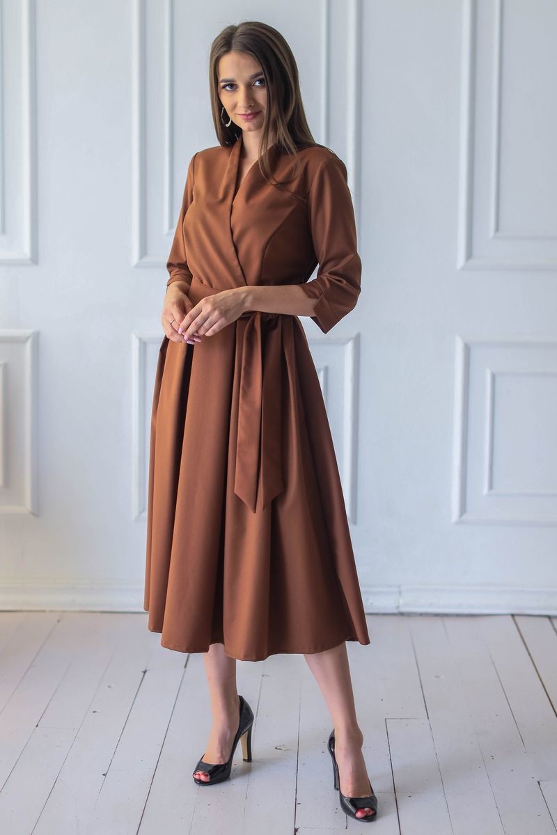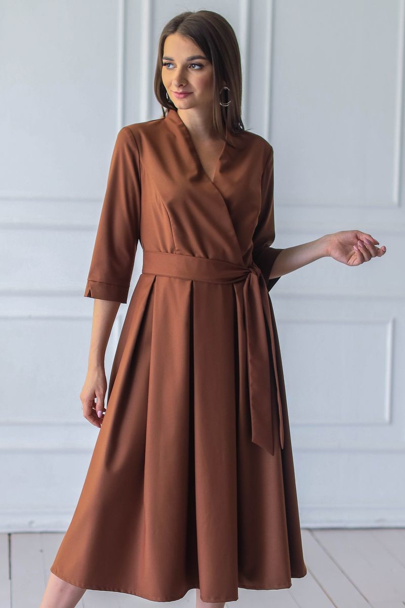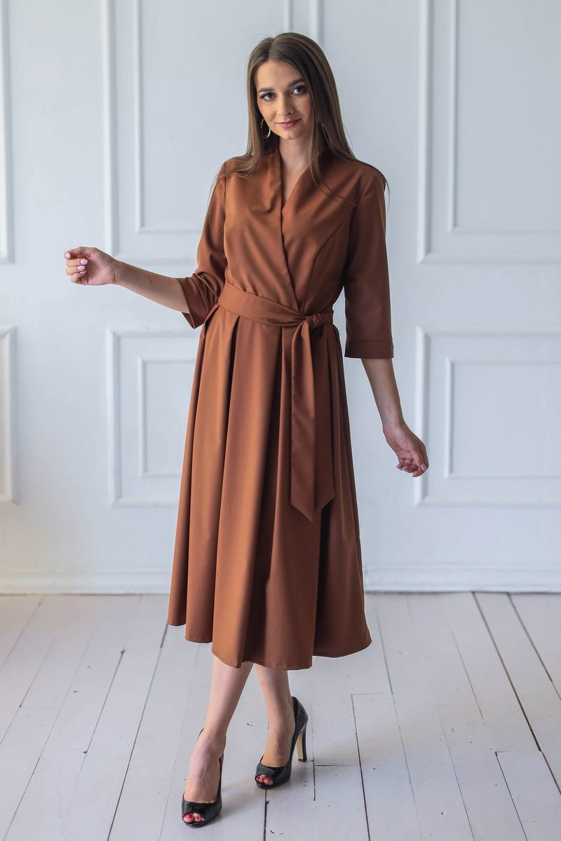 Элегантное платье длины миди. Модель отрезная по талии: верх изделия на запАх, юбка в складку. Втачной рукав, в комплекте пояс из основного полотна. Застежка на потайную молнию.