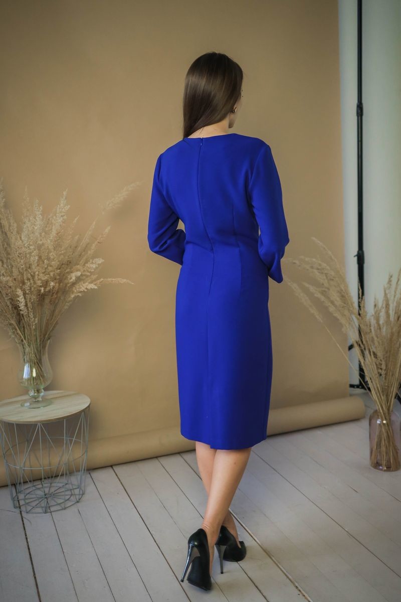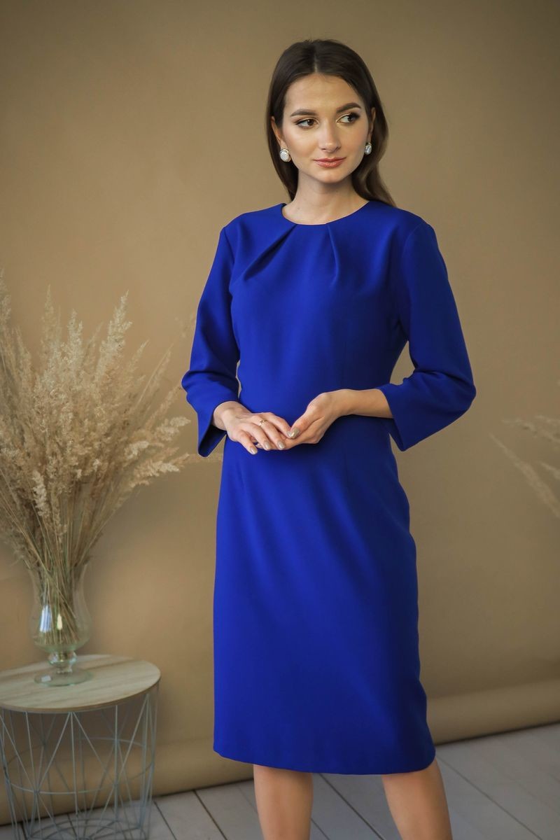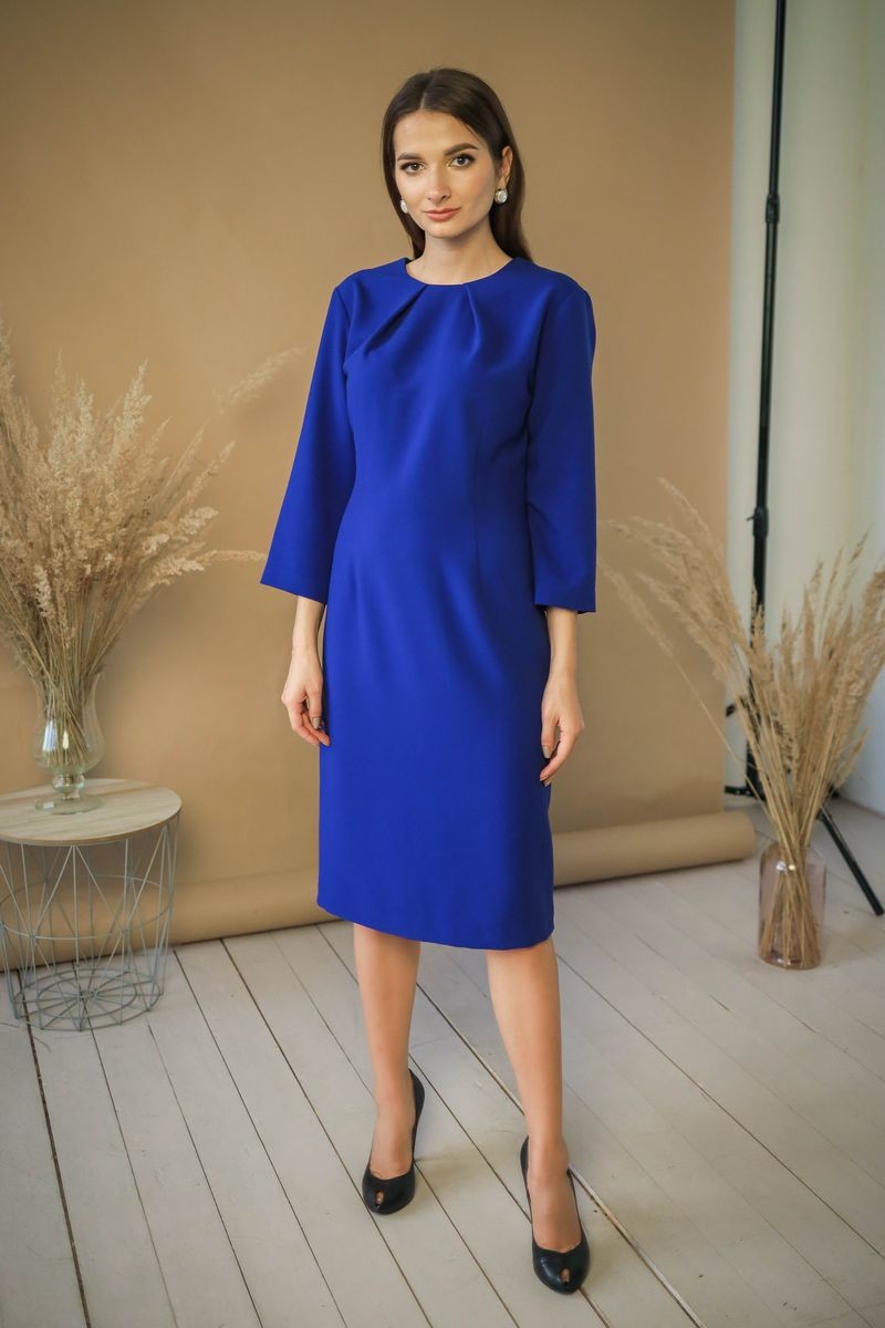 Платье-футляр из костюмной ткани с декоративными защипами по горловине. Длина - ниже колена. Сзади застежка на потайную молнию.
