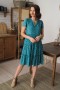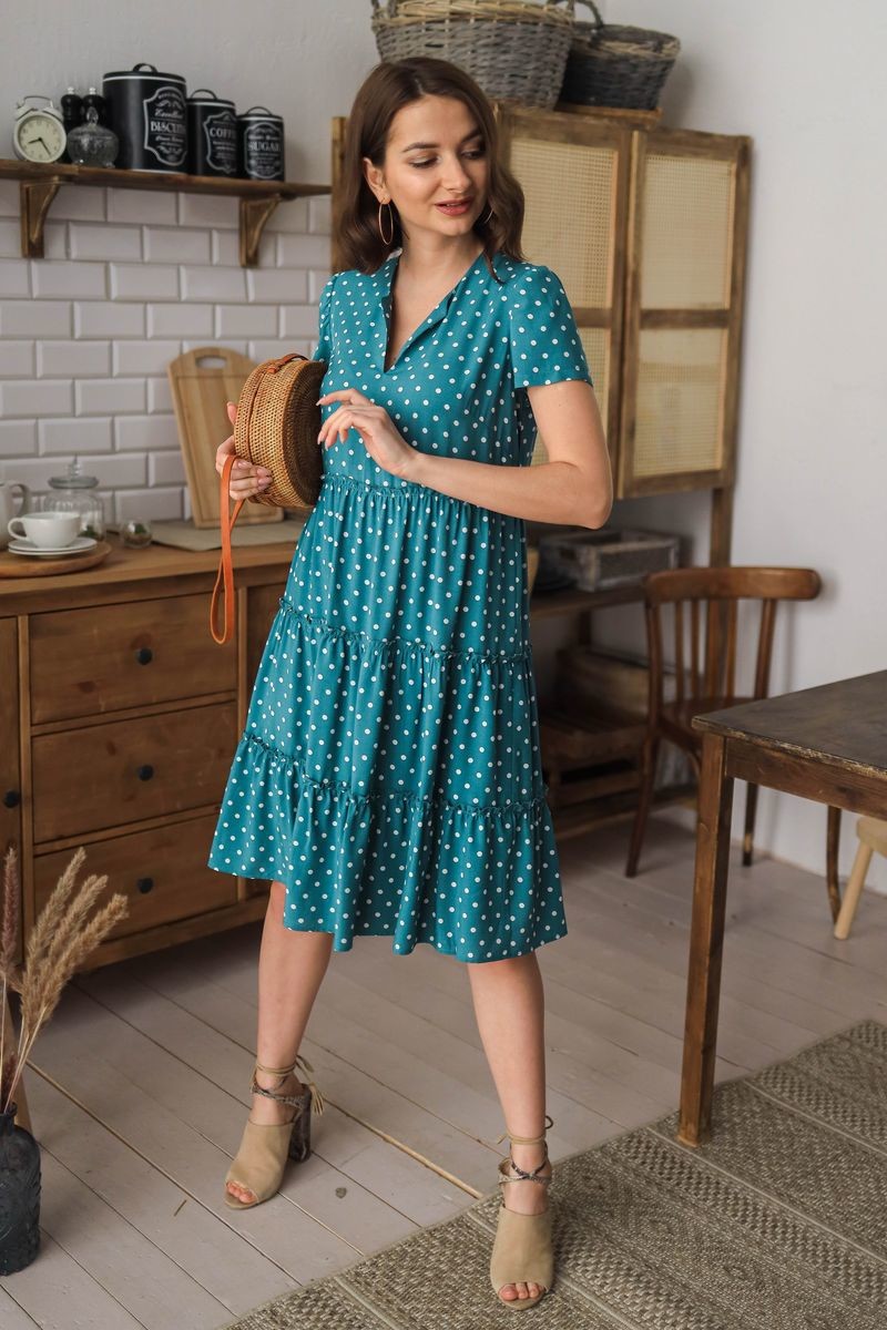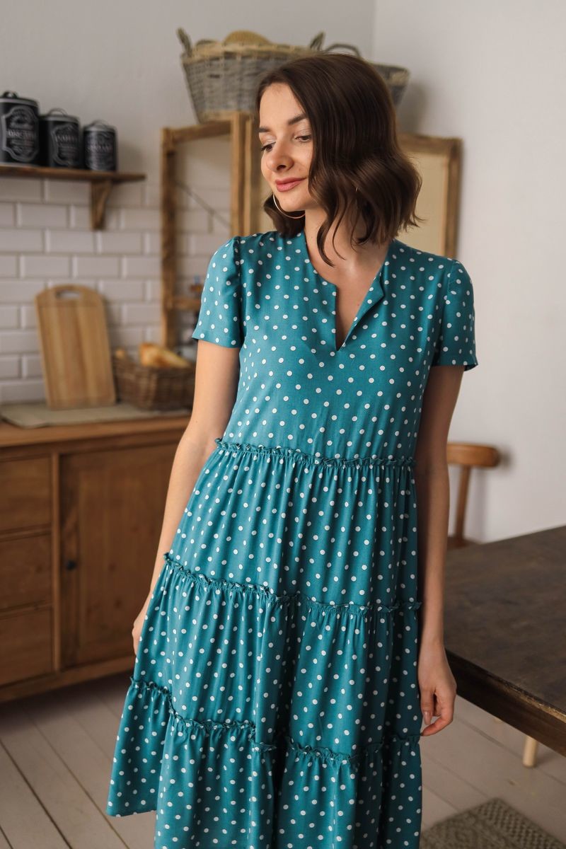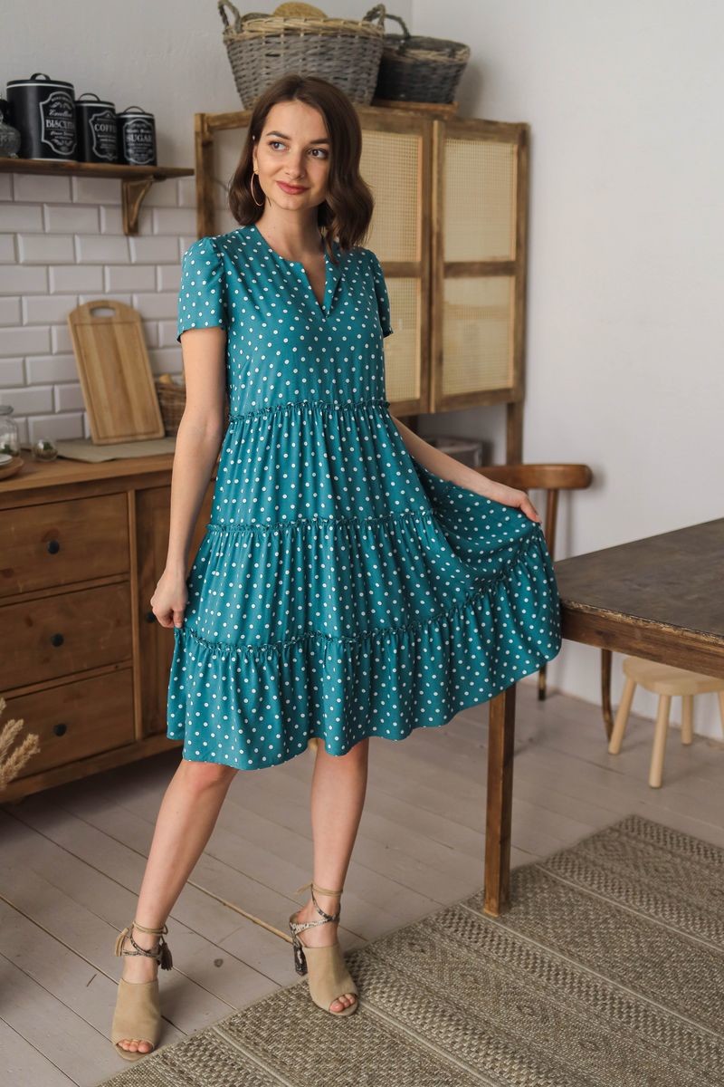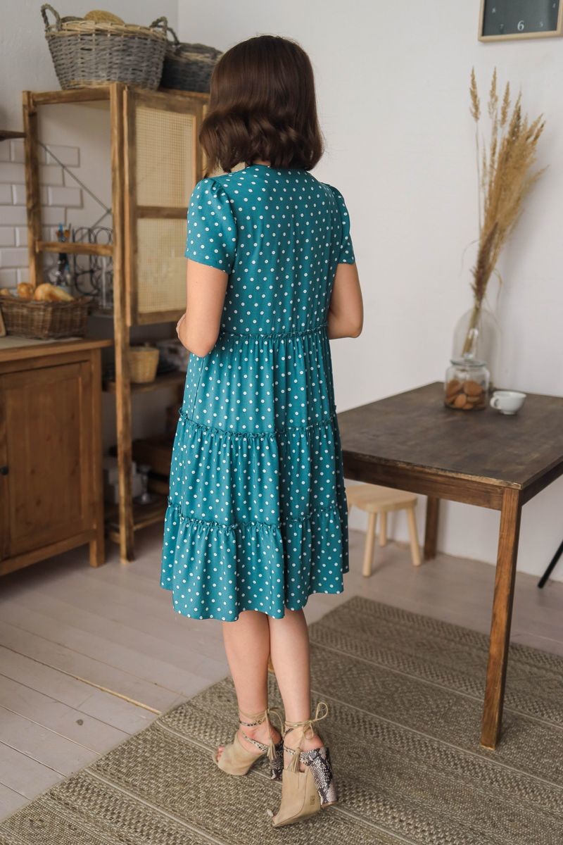 Платье расклешенного силуэта. Округлый вырез горловины, переходящий в элегантный разрез. Юбка отрезная по талии,на подкладке из мягкой сетки, из трех присобранных по шву воланов. Короткий втачной рукав.