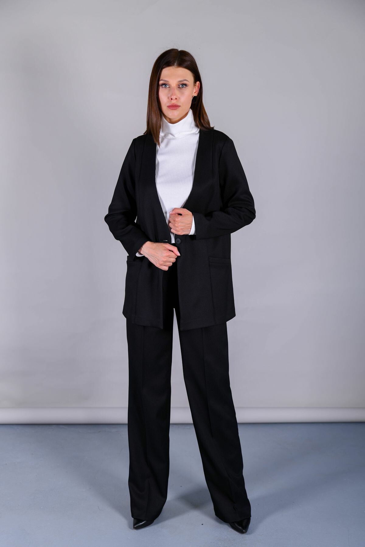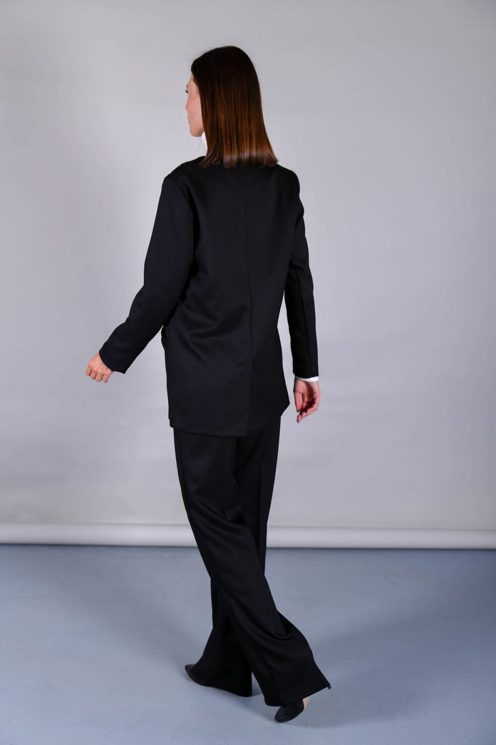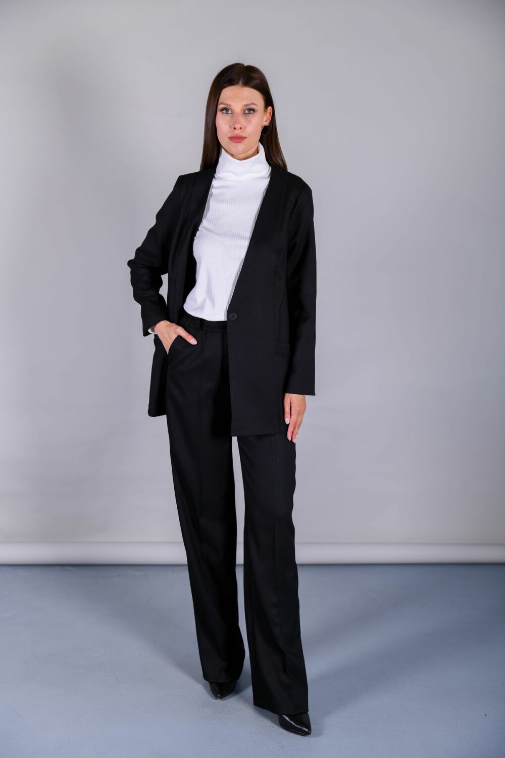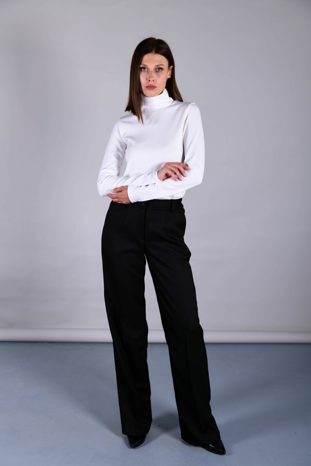 Брюки свободного прямого силуэта. В поясе резинка по боковым швам. Застежка на петлю и пуговицу спереди.